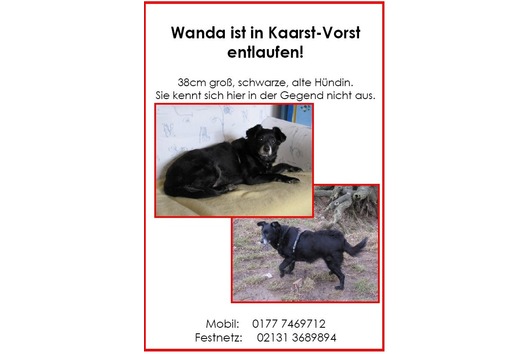 Da die Hinweise aus Kaarst u. Umgebung immer weniger werden,muss vermutet werden das Wanda sich entweder immer weiter wegbewegt hat,oder sie von einem Autofahrer mitgenommen wurde.