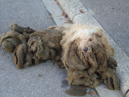 Die ganze Haut war entzündet und der Schwanz bereits nekrotisch. Der arme Rüde musste furchtbare Schmerzen über Wochen erdulden. Wir vermuten, dass er ein Puli (ungarischer Hütehund) war. Leider konnten wir ihm nicht mehr helfen, die Wunden waren zu groß und er konnte auch nicht mehr laufen, als er geschoren und die Krallen geschnitten waren. Außerdem hatte er verständlicherweise jegliches Vertrauen in Menschen verloren und ließ sich nicht anfassen. Wir durften ihn nicht länger leiden lassen und mussten ihn erlösen, was auch zum Tierschutz gehört.