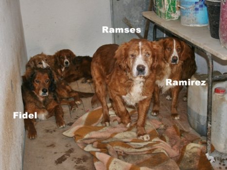 Ramirez und seine Familie (Ramses & Fidel) sind die sogenannten "Fabrikhunde von Olesa", denn sie wurden durch einen glücklichen Zufall einsam, verwahrlost und ohne jegliche Nahrung und Wasser auf einem verlassenen Fabrikgelände in Spanien gefunden. Wäre dies nicht geschehen, wären sie elendig verhungert und verdurstet. Die bildhübsche Settermixfamilie (vielleicht hat auch ein Bretone oder Retriever den Genweg gekreuzt?!) hat vermutlich nie Liebe und Zuwendung erfahren.
