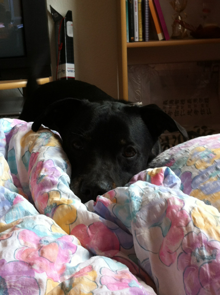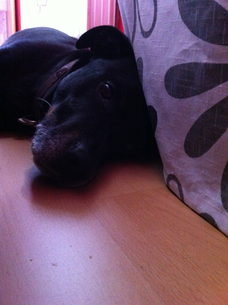 Zu Besuch bei meiner Spaziergängerin: "Dann geh ich halt in meine Ecke, hier ist es auch viel schöner als auf eurer blöden Couch :P"