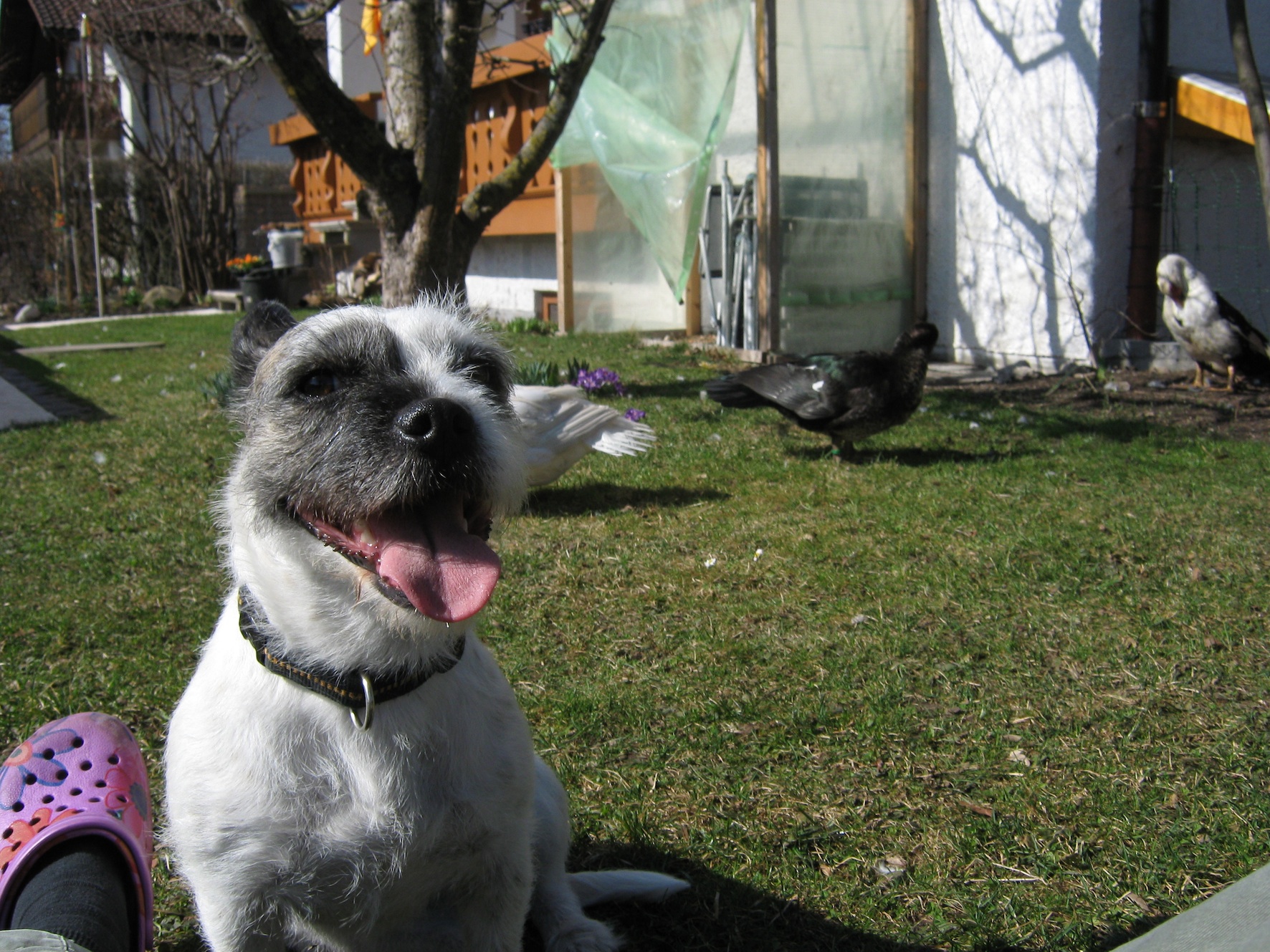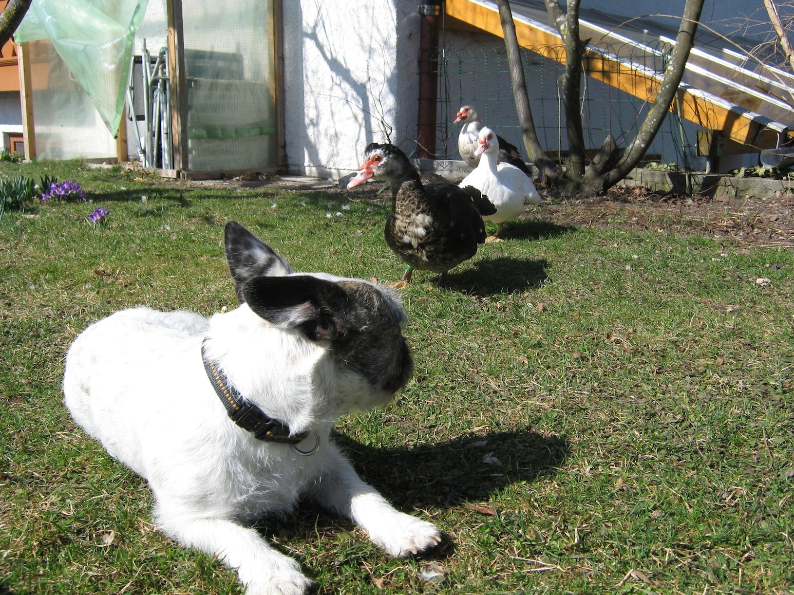 Naja, das sieht auf dem Foto vielleicht so aus, aber die Enten sind schon ein bischen kleiner, bis auf den Erpel Schorschi, der ist wirklich so groß wie Peggy. Aber die sind absolut friedlich, nur Peggy will´s gar nicht erst ausprobieren.