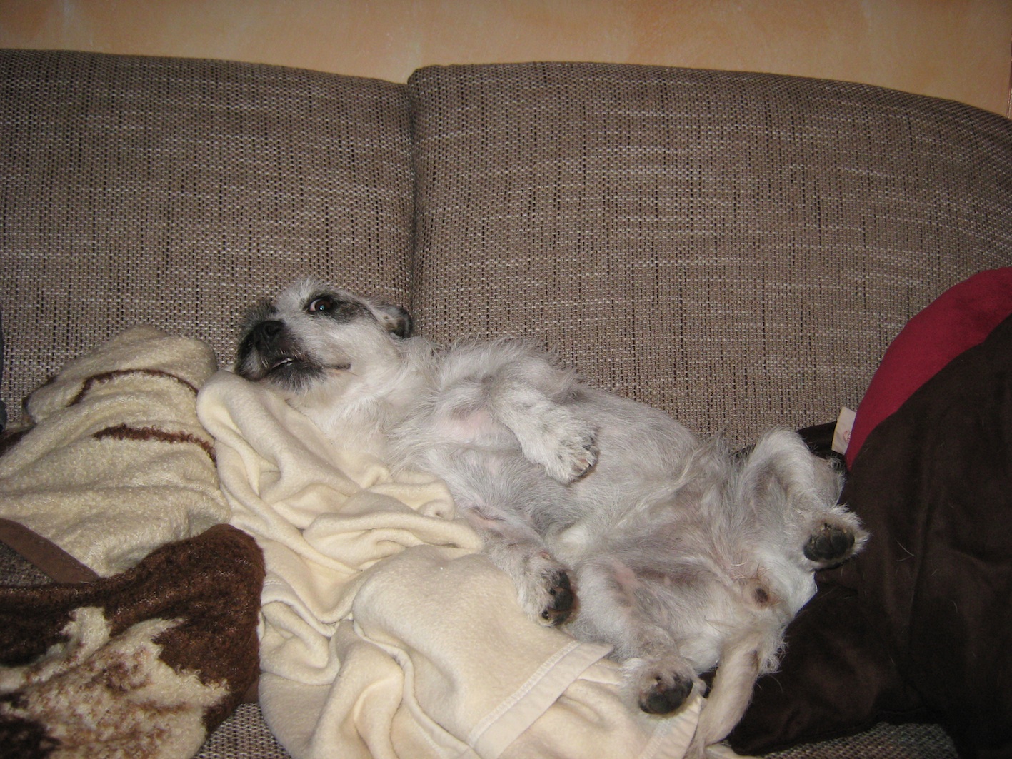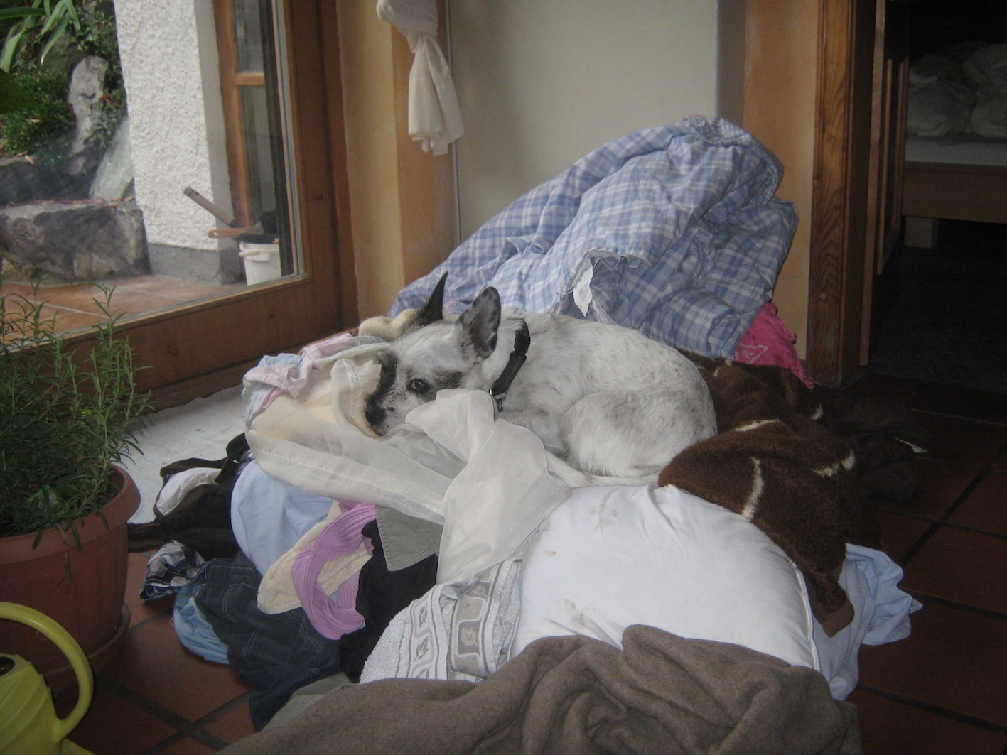 Das folgende Foto ist nach dem Urlaub entstanden, als ich die ganze Schmutzwäsche von 4 Wochen Campingurlaub auf ein Haufen geworfen hab... Peggy dachte wohl das ist ihr neues gemütliches müffelndes Plätzchen Oder hier trohnt sie auf dem Deckenberg auf der Couch...