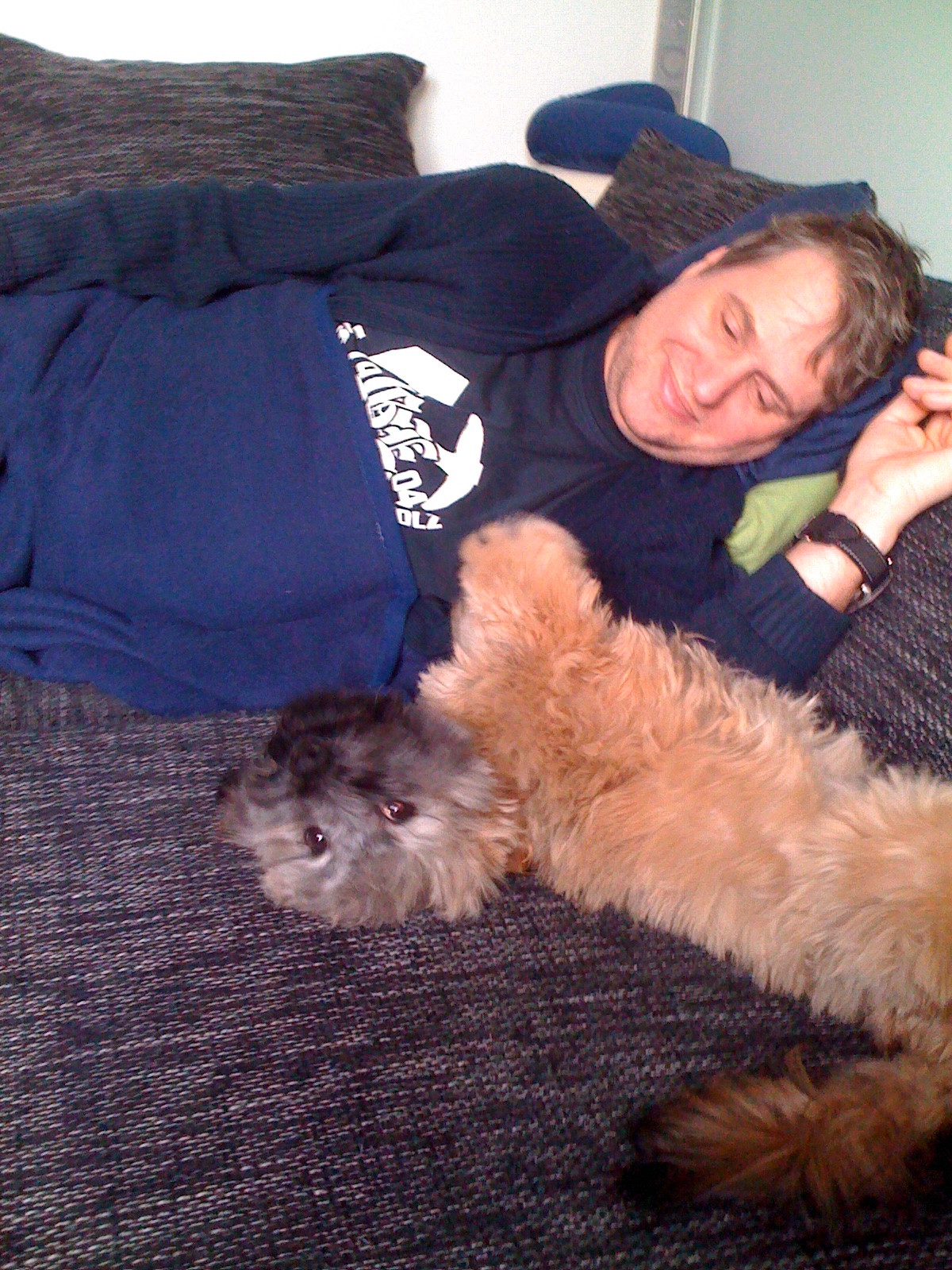 Re: Hude WettbewerbJa, Bob kuschelt super gerne, besonders wenn wir abends ins Bett gehen, da ist dann Herrchen drann.