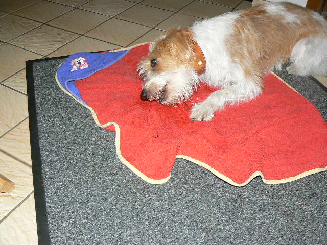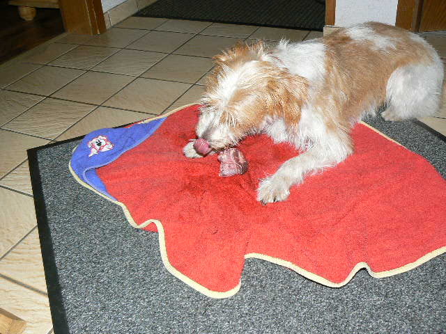 Da das Wetter nicht so wirklich ideal für ein Picknik war, wurde im Flur diniert. Ja und wie man sieht , kann die Dame sich sogar benehmen . Ist ganz artig beim Essen mit dem Fleisch auf Ihrem Handtuch geblieben, obwohl sie es sonst ganz gerne irgendwo versteckt oder noch besser vergräbt. Stolz bin .