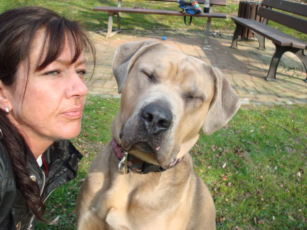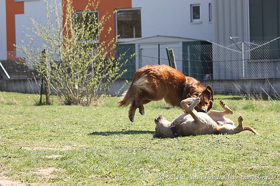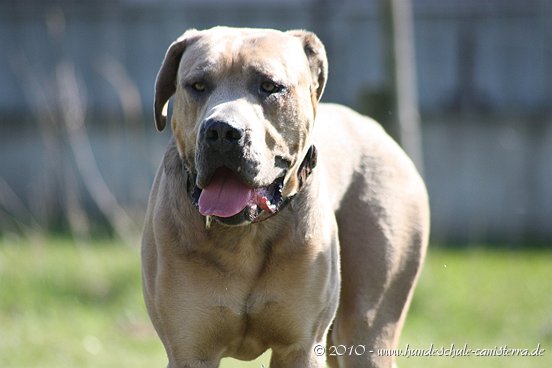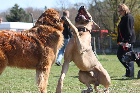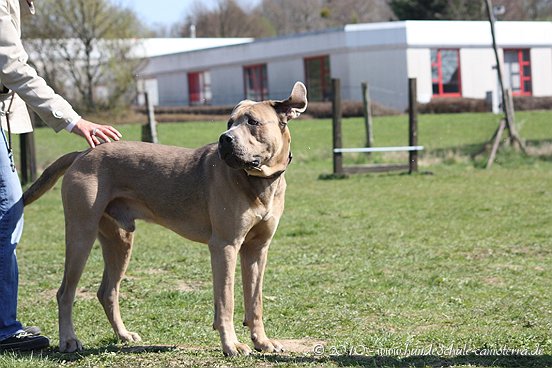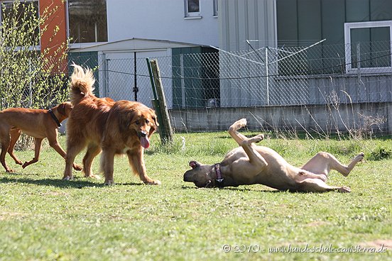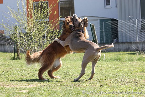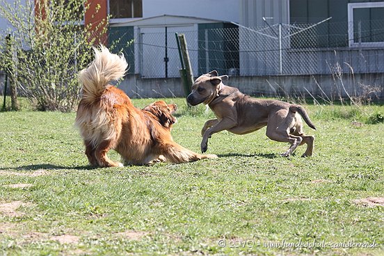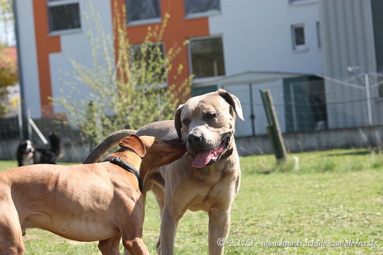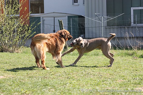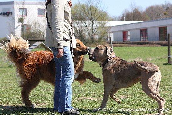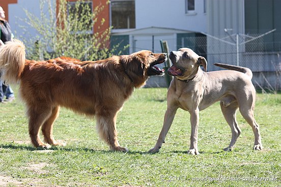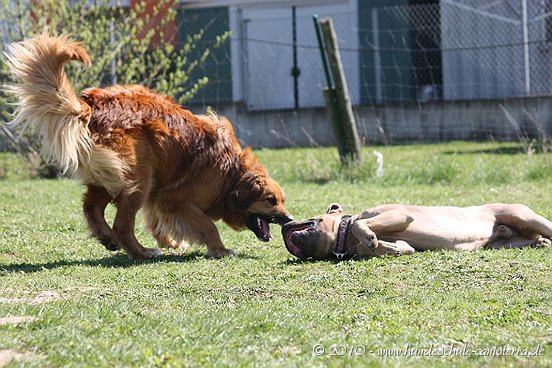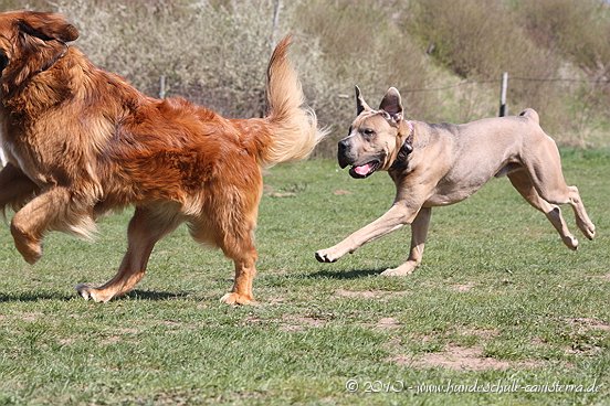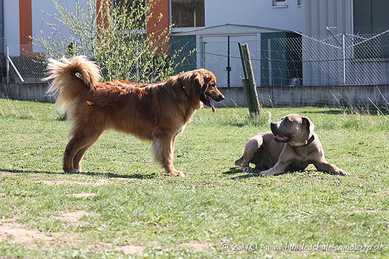 da ist mir das Isabel ja schon zuvor gekommen...tja, wenn man in Grasdorf lebt, hat man ja auch ´ne Menge Zeit, nicht war Isabel Da liegt der Hund ja sozusagen begraben für meine städtischen Verhältnisse Ja, weiß gar nicht womit ich anfangen soll... ...bin nachhaltig beeindruckt von Jenni´s Arbeit und Wissen. Bin ohne konkrete Vorstellungen dorthin gefahren. Das eine oder andere Manko gibt es schon zwischen Lennox und mir...dachte ich. Wir haben zunächst einmal an der Rockergrupper teilgenommen, in der ich auch Isabel mit Rocco und Claudia mit Logan "kennenlernen" durfte. Beide sehen aus wie auf den Bildern in "Foris im Bilde"....also nicht geschummelt Zunächst war ich ein wenig verunsichert, Ihr erinnert Euch, ich hatte berichtet, dass Lennox sich nun nichts mehr gefallen lässt und ich war gespannt darauf, wie er sich da mittendrin so verhält und was Jenni dazu zu sagen hat. Bevor das Ganze begann, hat mich Jenni auf einen Golden Retriever aufmerksam gemacht, der nicht s ganz einfach ist, also andere Hunde auch blöd anmacht...oje, dachte ich. Dann auch zwei Berner Sennen dabei...mir haben ein bißchen die Knie geschlottert ( ich bin ganz ehrlich ). Habe versucht, es mir nicht anmerken zu lassen. Zunächst einmal war Lennox sichtlich verunsichert, soviele neue Hunde. Er ist kaum von meiner Seite gewichen. Hat sich das ganze Treiben erst einmal aus der Ferne betrachtet, aus Mama´s sicherer Nähe. Hat dann gelegentlich einen Ausflug gewagt um den einen oder anderen Kollegen abzuchecken um sich dann aber wieder in sicherer Nähe von Mama zu begeben. Es hat eine Weile gedauert bis er die Lage für sich abgecheckt hat um dann eine besondere Sympathie für die Leonberger-Mix Hündin für sich zu entdecken und er mit ihr super schön gespielt hat, wie Ihr schön auf den Bildern erkennen könnt. Ab und zu kam da mal Jemand dazu, aber so wirkliches Interesse hatte er nur für diese hübsche Dame. Jenni´s Statement zum Sozialverhalten von Lennox: SUPER Sie sagte mir, da hätte ich wirklich ganze Arbeit geleistet. Lennox ist ein sehr gut sozialisierter Hund, der klasse mit anderen Hunde kommuniziert und überhaupt nicht auf Stress aus ist. Er steht schon seinen Mann, aber macht man ihn nicht doof an, macht er auch nicht doof an. Und ein großes Kompliment hat sie mir damit gemacht als sie mir sagte, würde ich in der Nähe wohnen, dürfte ich jede Woche so in die Rockergruppe kommen, da Lennox sich super dafür eignen würde...ist das nicht ein tolles Kompliment Nach der Rockergruppe hatten Lennox und ich ein bißchen Zeit uns zu erholen um uns dann anschließend mit Jenni zu einem Gespräch zu treffen. Wir haben uns nett auf die Terasse eines Lokals gesetzt, lecker gespeist und uns klasse unterhalten. Während der Unterhaltung waren unsere Hunde mit von der Partie. Lennox wie immer neben mir, so habe ich ihn bisher in solchen Situationen positioniert. So konnte Jenni live miterleben, welchen Molosserdickkopf mein Lennox hat. Ich weiß nicht wie oft ich meinen Lennox ins Platz habe versucht zu bringen und Jenni konnte verstehen, warum man Lennox nicht böse sein kann. Er saß neben mir und auf das Kommando PLATZ hat er mich mit einer Gelassenheit angesehen, dass ich des Öfteren schmunzeln muss, obwohl ich weiß, dass es falsch ist. Jenni hatte größtes Verständnis für mich und bewunderte mich in Bezug auf Geduld und ebenfalls Gelassenheit. Sie sagte, dass wir beide optimal zusammen passen, da Lennox so wahrscheinlich die richtige Erziehung genießt, also alles ganz ruhig und gelassen, ja so bin ich auch und werde auch gar nicht ungeduldig, was Lennox zu Gute kommt, so Jenni. Also, wäre ich ein Hund, dann sicher ein Molosser Sie meinte, dass sie um Einiges impulsiver wäre und nicht diese Geduld aufbringen würde, wie ich es tue, es aber in Lennox Fall genau das Richtige ist. War für mich sehr schön dieses Feedback zu bekommen, da es so den einen oder anderen Klugscheißer gibt, der meint, ich müsse mich richtig durchsetzen, ich wäre viel zu geduldig mit ihm. Aber wie bitteschön soll ich einen fast 50kg schweren Hund dazu bewegen PLATZ zu machen, wenn er es nicht tut ?? Ihn ins PLATZ drücken? Mir bleibt nur, ihn konsequent immer wieder daran zu erinnern, was ich von ihm möchte...und das mache ich, ebenso gelassen wie mein Lennox Jenni hat mir ausführlich das Ampelsystem erklärt und wir haben es mit Lennox in die Praxis umgesetzt. Ich war beeindruckt, wie super gut das funktioniert. Das wird in Zukunft meine Methode sein, um von Lennox das zu bekommen, was ich von ihm möchte. Das schönste Kompliment hat mirJenni damit gemacht, dass sie mir sagte; in dreizehn Jahren wären ihr nur für eine Hand ausreichend Molosser-Mensch Team begegnet, zwischen denen die Beziehung so gut ist wie zwischen Lennox und mir. Die Beziehung zwischen Lennox und mir ist so gut und er möchte seiner "Mama" einfach nur gefallen. Man würde merken, dass ich in Bezug auf Lennox vieles intuitiv machen würde und es das Richtige wäre. Ich solle mich auch in Zukunft auf mein Bauchgefühl verlassen, weil dies gut wäre, dies würde man an Lennox sehen. Ich kann sagen, dass der Besuch bei Jenni richtig lohnenswert war. Sie hat mir ein Gefühl von Sicherheit gegeben, was ich dringend brauchte nach der derzeitigen Entwicklung von Lennox. Lennox ist mein erster Hund und ich mache natürlich Vieles aus dem Bauch heraus. Das es richtig ist, hat mir Jenni nun bestätigt und das tut mir unglaublich gut. Also mache ich genauso weiter und fühle mich einfach total gut nach diesem Weekend Allein für die tollen Bilder, die sie hat machen lassen, hat sich der Besuch schon gelohnt....klasse Bilder Isabel hat ja schon einige hier rein gestellt, danke an dieser Stelle....werde mal schauen, ob ich noch das eine oder andere Bild mit hier rein tue. Muss erst mal schauen, sind sooooo viele Schade, dass Jenni nicht mehr hier ist, hoffe aber, dass ich Alles richtig wiedergegeben und nichts verdreht habe. Ich kann nur jedem 