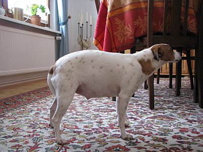 Nein, ein glücklicher Hund schaut anders aus....Paula leicht genervt und mit eingezogener Rute.