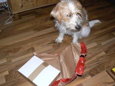 1 tolles Bildchen von dem Hund der Päckchenpackerin