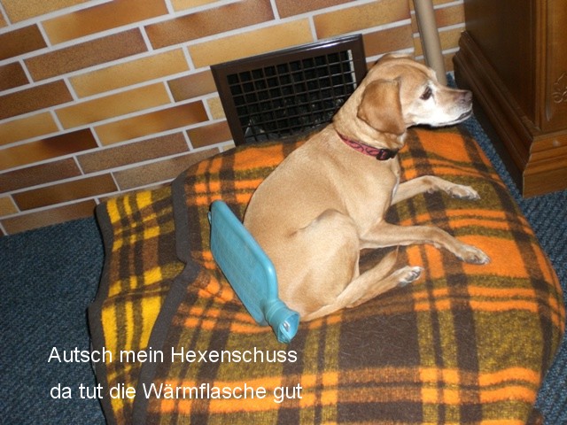 Mein Hund ist ein Jack Russel-Pinschermix. Sehr quirlig und immer den Schalk im Nacken. Aber eine ganze Liebe. Die Wehwehchen: manchmal Rückenprobleme,weil sie so wild ist. :hin und wieder Inkontinenz, wird behandelt(soll im Alter durch Kastration entstehen) : und die Zahnprobleme Aber sie hat Freude am Leben,Gassigehen und Freunde treffen mag sie gerne, nur Weibchen, da muss ich oft aufpassen. Spielen tut sie nur mit mir,früher sind wir immer zur Hundewiese gefahren,da war immer was los. Heute liebt sie ihre Spaziergänge und das ausgiebiges Schnüffeln. Alles hat seine Zeit. Ich wünsche einen schönen Tag wirbelwind Hier noch ein Foto , da ist ihr Lieblingsplatz, als junger Hund und auch jetzt noch....