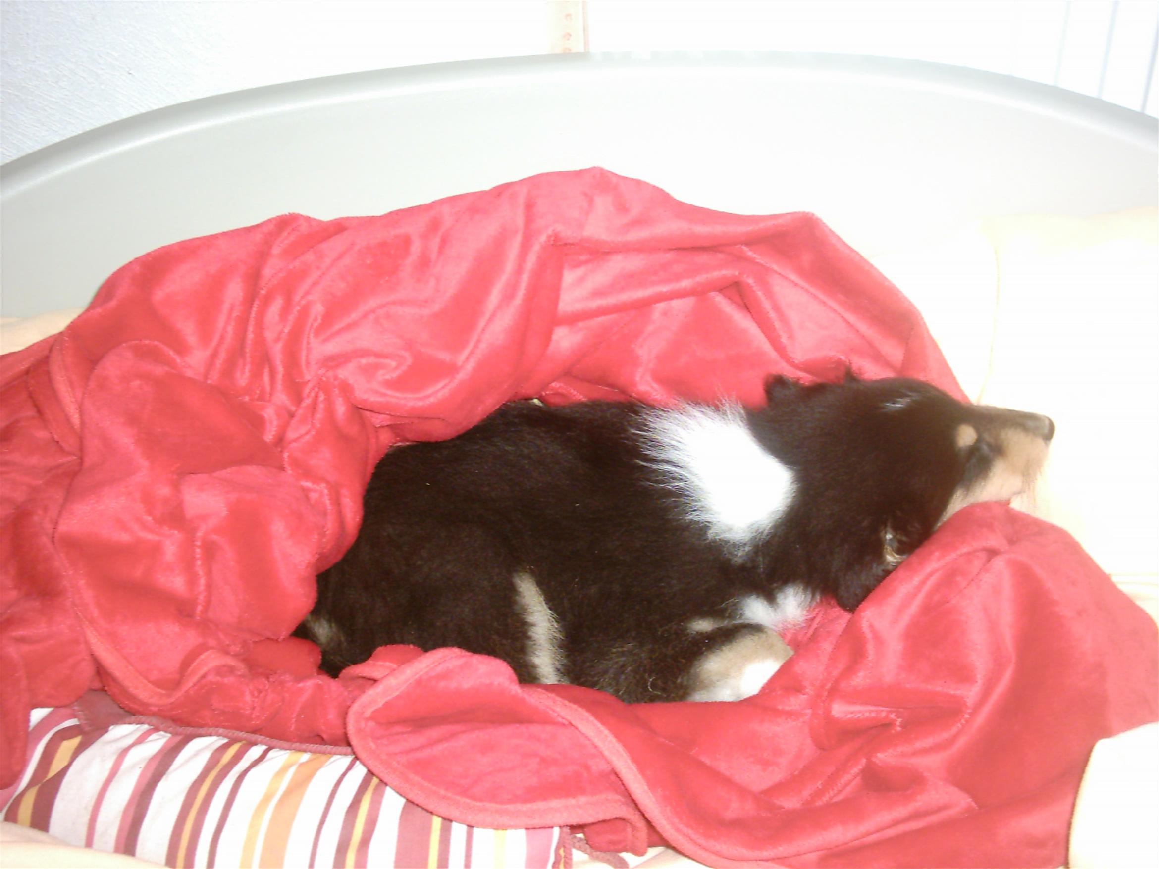 Mellie und Leah, die sich vom WE erholen muss und den Kleinen skeptisch aber freundlich beäugt und der Kleine, der schläft, weil er sich auch vom WE und vom Tierarzt erholen muss.