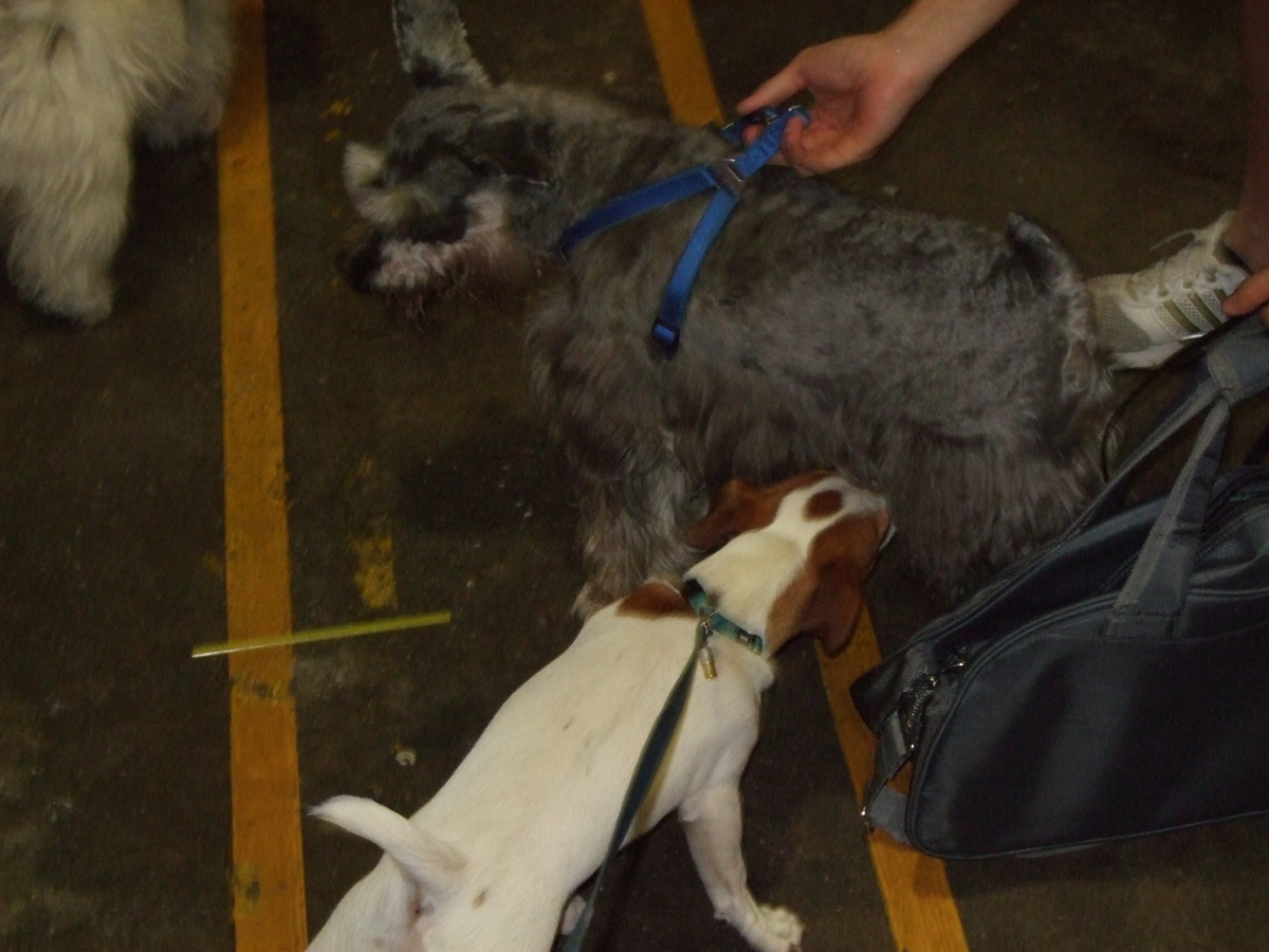 Lissy war da wesentlich zurueckhaltender um nicht zu sagen fast schon aengstlich... wenn so 2 aufeinmal auf sie zukamen hat sie sich hinter Ronny versteckt.... nach ner Weile ist sie mutiger geworden und ist auch mal auf andere Hunde zugegangen... und sie hat Drogenhund gespielt... als wir an der Tuer standen wurde jeder abgeschnueffelt :D. Ich war doch ueberrascht, das sie so zurueckhaltend war denn ansonsten will sie ja eigentlich zu jedem Hund hin den sie sieht... Aber ich war auch sehr stolz auf sie, das sie mit jedem Hund einfach nur geschnueffelt hat und nicht geknurrt oder schlimmeres getan hat (war mir da bei ihr nicht so sicher)... wenns ihr zuviel wurde hat sich halt hinter Ronny versteckt, aber immer wieder von alleine vor gekommen, als Ronny dann mal ein bisschen weiter in den Saal rein ist um sich auf nen Stuhl zu setzen hat sie sich brav daneber gesetzt.
