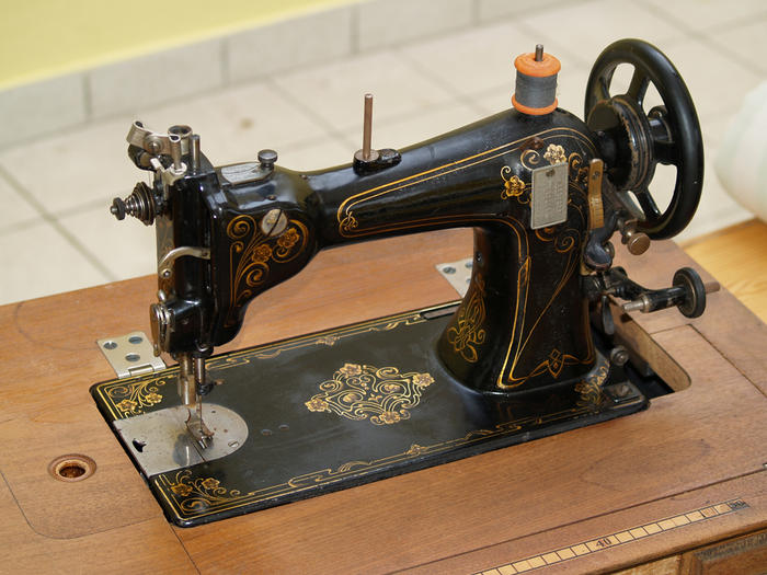 Das Blattgold ist aber unter einer Klarlackschicht geschützt. Der ist nur an der Oberseite stumpf geworden (glücklicherweise dort wo keine Verzierung ist), ansonsten ist er Top in Schuss. Mein Opa hat damit Jahrelang Zierteile für Geschirre, Polster und Co genäht, das sieht man ihr überhaupt nicht an. Habe aber trotzdem *Achtung, Perfektionsmodus an* zum Schutz der Maschine ein Stück Filz zugeschnitten. Der wird beim Nähen auf den Tisch gelegt und schützt Maschine (bzw die Verzierungen am Boden) und das Lineal aus Holzintarsien.