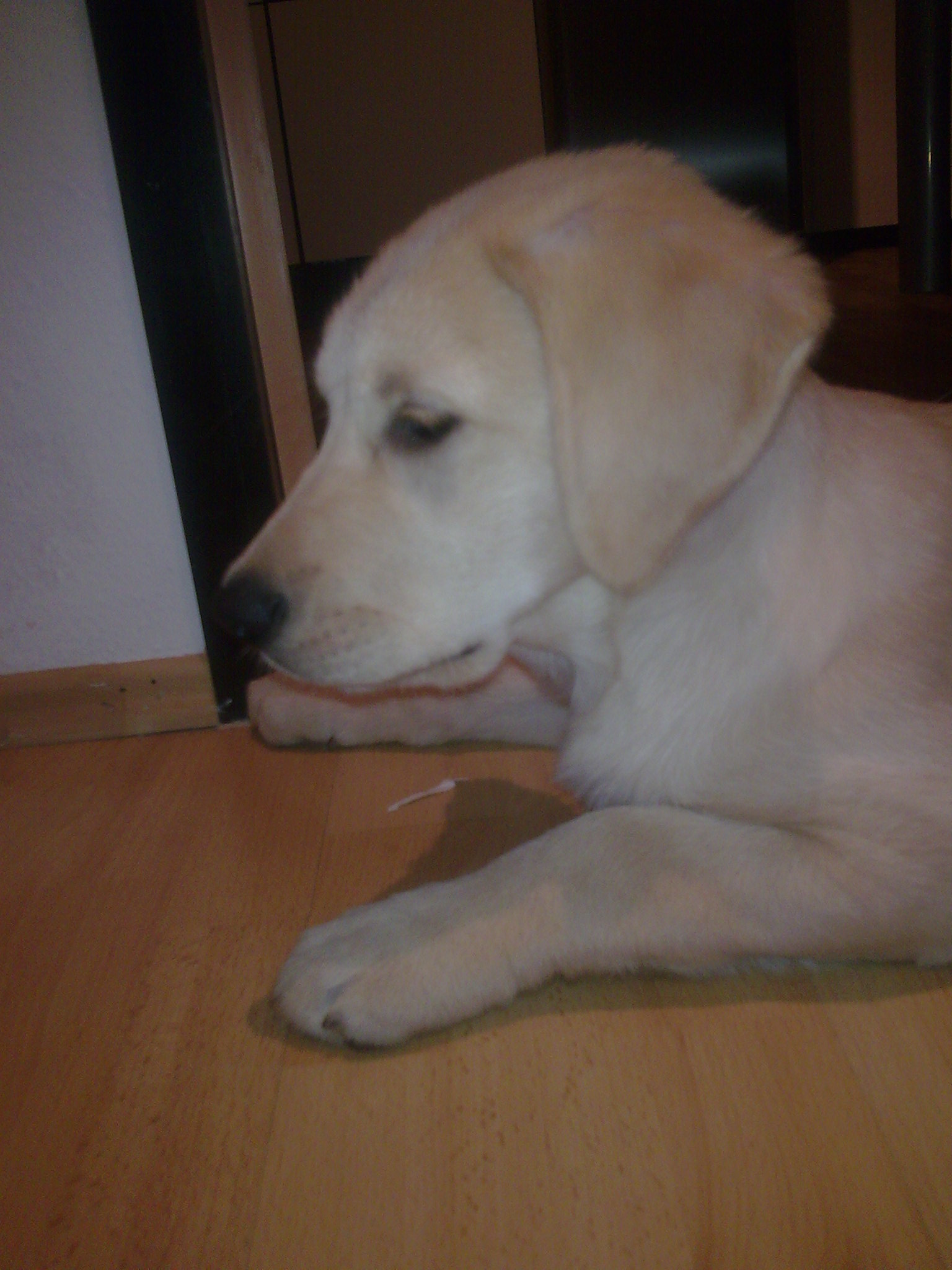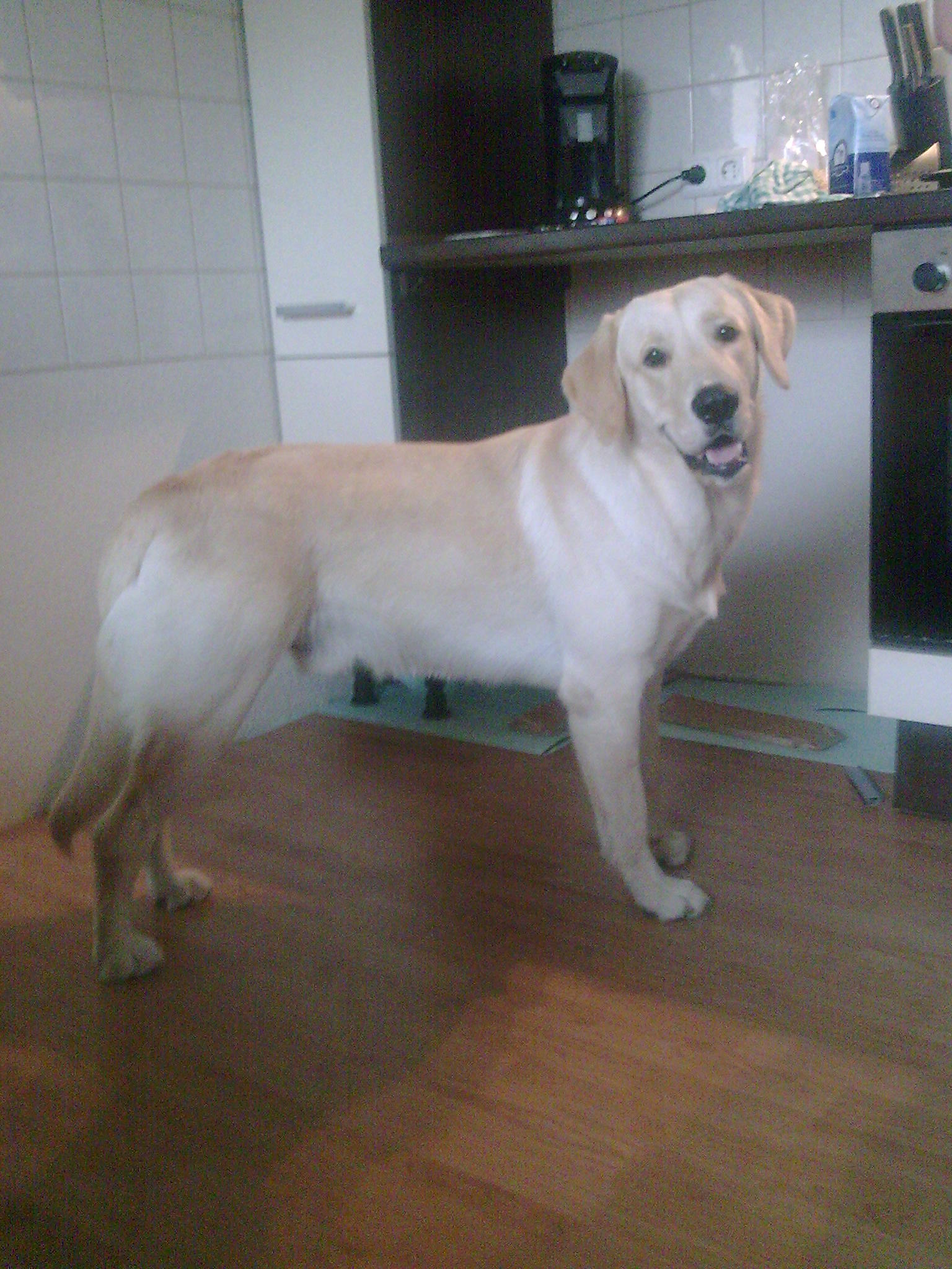 Sanchez ist jetzt 10 Monate alt. Wir haben ihn seit er acht Wochen alt war. Sein Wurf war der erste den wir uns angeschaut haben, wir haben uns sofort verliebt und ihn direkt mitgenommen. Die Frau von der wir ihn haben hat früher gezüchtet und Sanchez Mutter, Luna, war eigentlich der Hund ihrer Freundin. Die Trächtigkeit von Luna sei ein "Gassigehunfall" gewesen von dem die Besitzerin aber nichts mitbekommen hat (ja, ich weiß, im Nachhinein hört sich das alles sehr unglaubwürdig an) und aus allen Wolken gefallen ist als sich heraus stellte dass Luna trächtig ist. Besagte Ex-Züchterin hat ihrer Freundin dann angeboten Luna solange bei sich auf zu nehmen bis die Welpen vermittelt sind...danach wollte die Besitzerin Luna aber nicht mehr zurück haben(traurig, nicht wahr). Laut der "Züchterin" soll der Papa von Sanchez ein Golden Retriever gewesen sein. Luna ein Labrador. Nachdem Sanchez mit seinen 10 Monaten aber schon 67 cm und fast 40Kg hat, fremden Menschen gegenüber sehr misstrauisch ist und sich von diesen auch nicht gerne anfassen lässt sind wir mittlerweile davon überzeugt dass der Golden in Wirklichkeit ein Hovawart war. Er hat auch den langen Kopf und Körperbau und recht lange Beine.