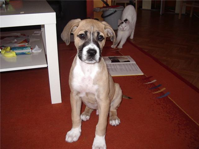 ja, die katze liebt er heiß u innig. fast schon zu sehr. aber sie wehrt sich auch. muß er auch lernen... tja, wo der hinwächst bin ja auch mal gespannt. als ich ihn vor 7 wochen bekommen habe hatte er gerade so 2 kilo gehabt. gestern waren es 8,2!!! hat jetzt eine schulterhöhe von 35 cm. brustumfang von 44cm. lg susi & co
