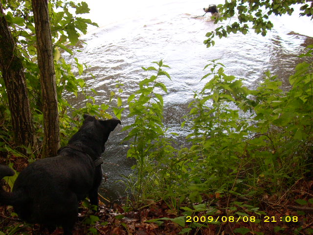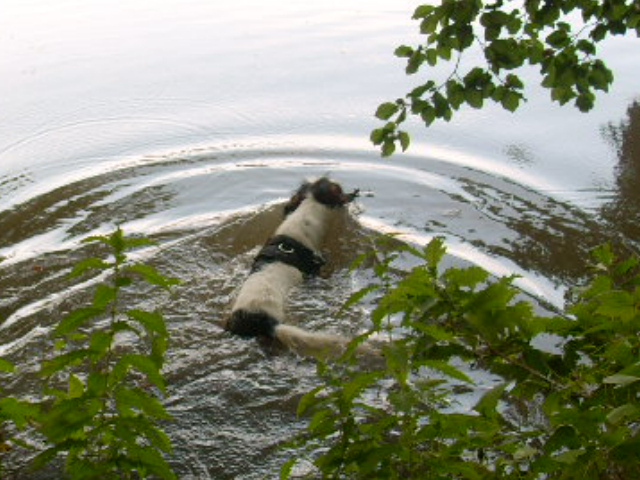 macht sie aber nur wo sie darf, bei uns daheim nicht, gut erzogener kromi eben alaska schwimmt auch wie ne verrückte, bella nicht, die guckt ihr beim schwimmen nur immer zu, schaut mal unten auf den bildern, da erkennt ihr's vielleicht dafür: bella sucht wie eine verrückte sämtliche fährten die man ihr legt............. naja, so unterschiedlich sind meine hundis...............