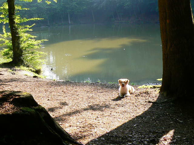 Heute war er wieder etwas "mutiger", er war bis über die Bauchgrenze drin, ich habe ihn mit getrocknetem Hähnchenfleisch gelockt :P .Allerdings ging er nicht weiter, er stand dann im Wasser und hat gepfinst und gejammert. Ich bin dann langsam wieder weiter Richtung Land ich will ihm ja den Spaß nicht verderben, immer langsam mit jungen Pferden/äh Hunden. :) Wenn er festen Boden unter den Pfoten hat ist alles kein Problem, da hüpft und springt im Wasser er seinem Spielzeug nach. Das ist echt supersüß! :lol: