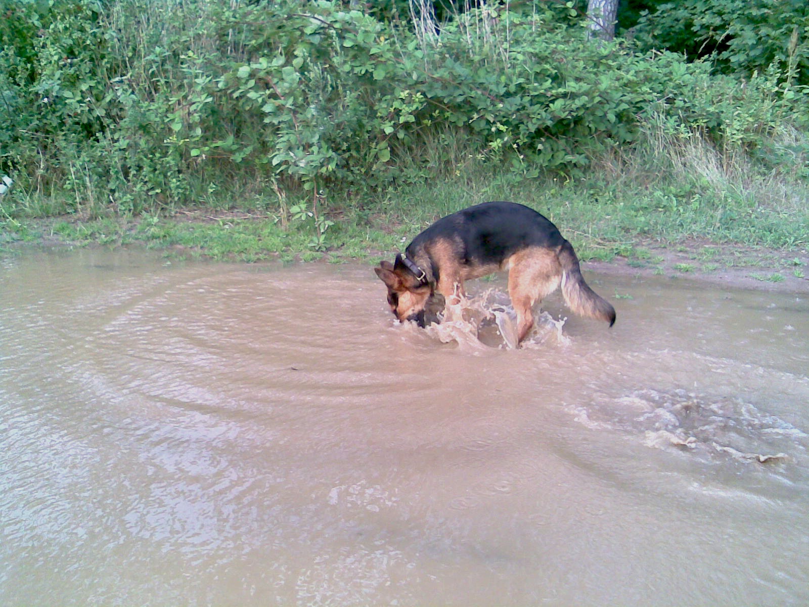 Zur Abendrunde sind wir an einer für Mini großen Pfütze vorbeigekommen um die sie früher einen großen Bogen gemacht hätte (zumal auch noch schlammig - da ging es früher NUR bis zu den Pfoten rein). Aber nachdem Mo ihr am Sonntag den letzten inneren Konflikt (Mini hüpfte an dem Bach entlang in dem Mo rannte und wollte rein, aber auch wieder nicht: "oh, Wasser...toll..oh nee...oder doch...nee...ach doch..neeeee") abgenommen hatte und beim raushüpfen aus dem Bach Mini an ihm abgeprallt und in den Bach geplumpst ist, ist Mini eine richtige Wasserratte geworden :)