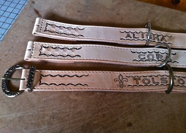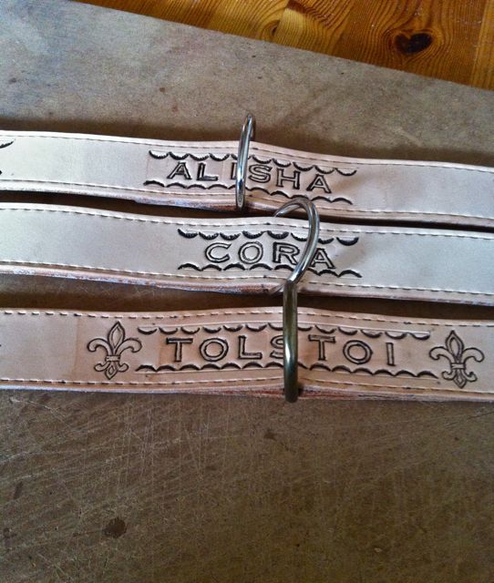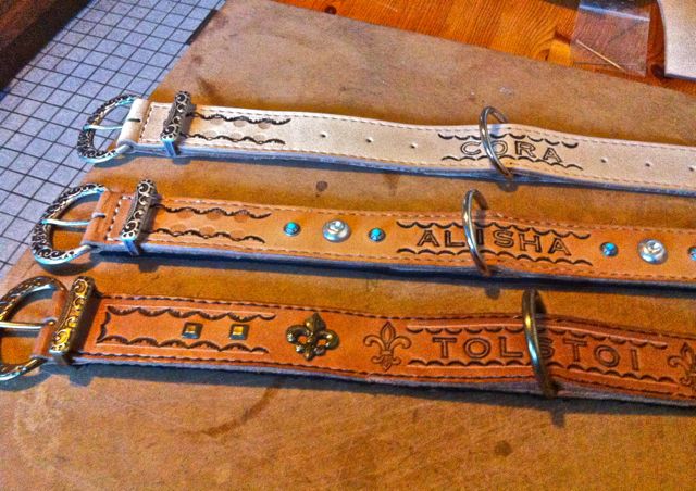 heute noch mal ein kleines Foto-update zu den Halsbändern von Elo. Sie nehmen langsam Form an. Vorab möchte ich mich für die schlechte Fotoqualität entschuldigen, aber morgens um 6.00 Uhr und mit Kunstlicht taugt das Handy nicht wirklich zum fotografieren. Für Tolstoi habe ich für die Schließe, Ziernieten und D-Ring Altmessing gewählt. Für die beiden Mädels habe ich Altsilber genommen. Hier kann man auch schön sehen, wie das Leder nach jedem Finish etwas dunkler wird. Das obere ist quasi noch unbehandelt. Hier ist die Polsterung der Rückseite zu sehen. 2mm dickes Moosgummi und 1mm dickes Futterleder. .....sehr sehr weich und wunderbar anschmiegsam. Für Tolstoi habe ich eine dunkelbraune Kontrastnaht gewählt, für die Mädels eine helle. Meine Rakna schaut immer schon ganz neidig. .......so jetzt muss ich weiter machen. Tschöö