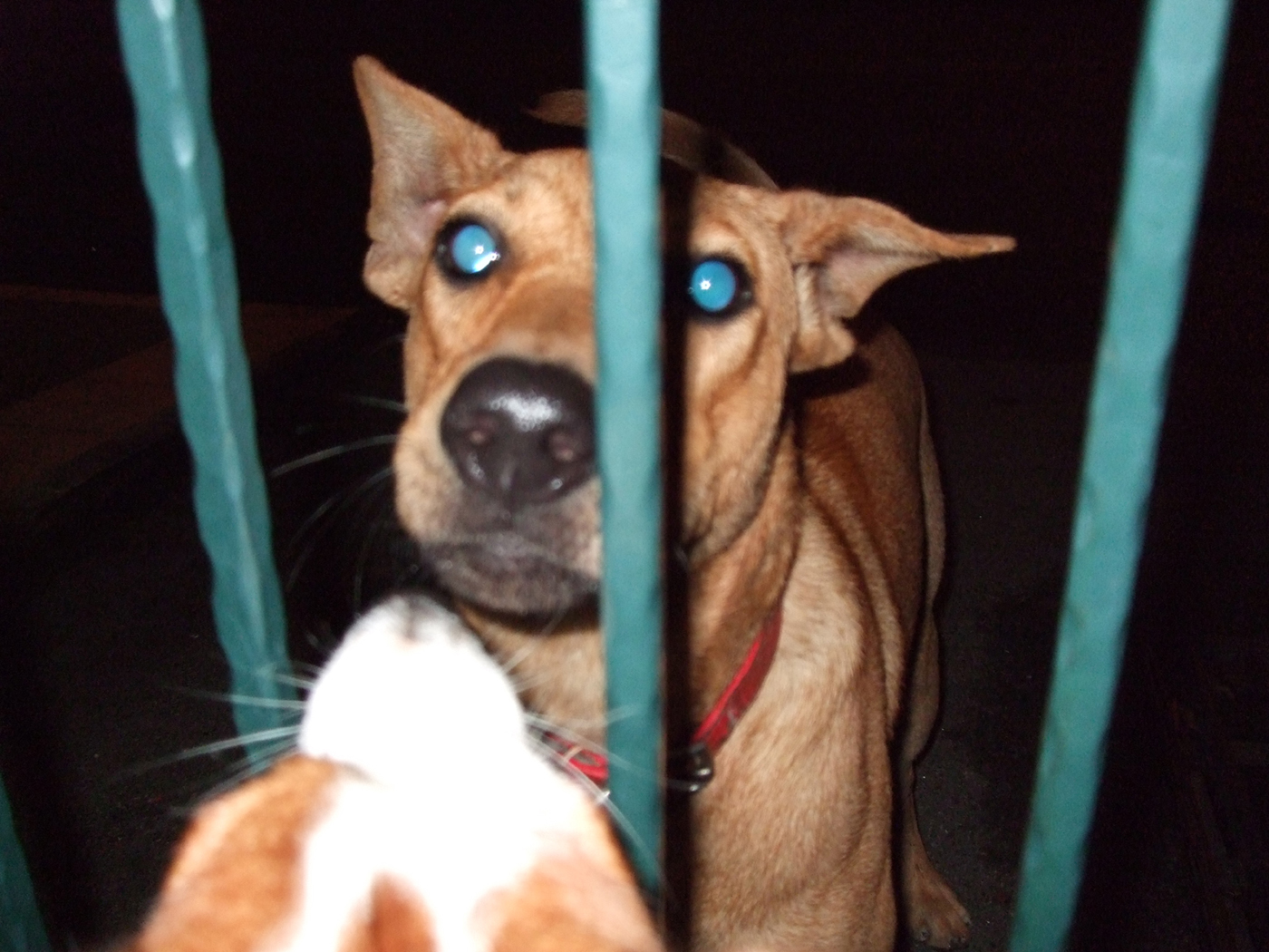 gestern durfte der kleine Labby (er heisst uebringes Max), der mittlerweile doch schon Recht gross geworden ist, mal ohne Leine rennen und toben Er hat es richtig genossen So konnte er auch mal richtig mit Toby rumtoben!! Der braune, von dem ich schon berichtet habe stand auf einmal da, Toby in voller Spiellaune rennt auf ihn zu... ich dachte nur ohhhh NEIN... doch was macht der? Er dreht sich rum und rennt vor Toby davon Gott sei Dank rannte er nur bis zu dem Haus an dem er gefuettert wird ansonsten waer mein Toby wohl wech gewesen... Haben ein bisschen rumgeschnueffelt und gut wars... puh.. mir viel ein Stein vom Herzen... Naja nu weiss ich wenigstens, das er erstmal nicht aggresiv auf andere Hunde reagiert... denn es hat sich noch ein GoldenRetriever von seiner Halterin befreien koennen und ist dem auch hinterhergerannt... doch alle waren friedlich. Hab mir dann Toby geschnappt und bin wieder zurueck gegangen zu Max, der uebringens dem nicht hinterhergerannt ist. Ploetzllich war da noch ein anderer Hund, irgendein Mischi... gross, braun mit rotem Lederhalsband... aber es fand sich kein Halter.... Ein wirklich huebscher Kerl... mit so wahnsinnig traurigen Augen.... es war total interessant immer wenn er sich dem Pudelrudel naehrte haben sie ihn vertrieben... er ist dann auch immer wieder ein Stueck weg... Hat die Pudel aber in keinster Weise angemacht, weder geknurrt noch sonstwas... Hat sich dann auf ein Spiel mit Max eingelassen und mein Toby gleich dazu... Nur als dann 2 so grosse Hunde ueber ihm standen und er ab Boden lag, wurde mir das dann zuviel und ich habe ihn da rausgeholt, was Toby allerdings gar nicht gefallen hat... er haett da gern weiter mitgemischt... Der Hund kam immer wieder zu uns.... war echt ein total lieber Kerl. Nun denn als das Pudelrudel ging, ist er mit ihnen in die Richtung gegangen... Wir sind dann auch heim. Bei unserer Abendrunde um 23Uhr, kam er und der andere braune uns ploetzlich entgegen... da ich Lissy nicht so ganz traue, wenn Toby dabei ist, habe ich Toby auf den Arm genommen sie kurz und die 2 angebruellt sie sollten gefaelligst verschwinden... Bei dem einem hats auch funktioniert, er hat sofort kehrt gemacht und ist in die andere Richtung geganen, aber bei dem mit dem roten Halsband war alles bruellen vergebens... er ist zwar stehen geblieben... aber als wir dann wieder losgegangen sind ist er uns hinterher gegangen... Zu Hause angekommen, hab ich Toby in den Hof verfrachtet und Lissy abgeleint... sie wollte ja unbedingt zu ihm... von mittags wusste ich ja, das er nichts macht... trotzdem war mir nicht so ganz wohl... aber ich will Lissy ja auch nicht jeden Hundekontakt verbieten... und ohne Toby tut sie meist auch nichts... Lissy und er haben geschnueffelt soweit sie es zugelassen hat... am After darf ja nur Toby bei ihr schnueffeln, er hats auch schnell kapiert, das sie es nicht mag und hat es nicht mehr versucht.... Lissy hat ihn dann zum Spielen aufgefordert, doch das wollte er dann nicht so wirklich... Nach 10 min oder so hab ich dann Lissy auch in unseren Hof verfrachtet... Toby hing am Zaun und wollte zu dem grossen hin.... da hat sich Lissy dann dazwischengedraengt und hat den anderen angeknurrt... so nach dem Motto, lass mir blos den kleinen in Ruhe! Nach dem letzten Spaziergang des Tages, bekommen meine 2 immer noch ein Leckerlie... an dem sie ein bisschen mehr von haben... gestern haben sie z.B. ne Stange getrockneten Pansen bekommen, da der grosse immer noch vor unserem Tor war, hat er auch eine bekommen Er hat sie dann auch direkt vor unserem Tor verdrueckt... und wollte da gar nicht mehr weg Bin dann rein um meinen Foto zu holen, habe ein paar Bilder gemacht um sie dann hier im Petfinder einzustellen... Als ich wieder rauskam, lief grad das grosse Rudel die Strasse lang... da hat er sich denen angeschlossen..... und wech war er.... doch 5 min spaeter stand er wieder da Also wenn Lissy ihn nicht angeknurrt haette nachdem sie im Hof war, ich glaub ich haett ihn reingelassen... so ein huebscher Kerl und soooo traurige Augen Vor allem da ich das Gefuehl hatte, das er Kontakt zu Menschen gesucht hat und nicht unbedingt zu anderen Hunden, er hat mich immer wieder angeschaut, als wolle er sagen, lass mich doch rein... Heute habe ich ihn nicht mehr gesehen.... allerdings hat es auch den ganzen Tag geregnet... vielleicht hat er ein trockenes Plaetzchen gefunden oder noch besser den Weg nach Hause *hoff* lg