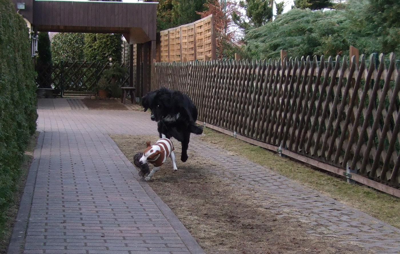 Das ist Cora, der Hund von Ronnys Eltern Cora und Toby spielen