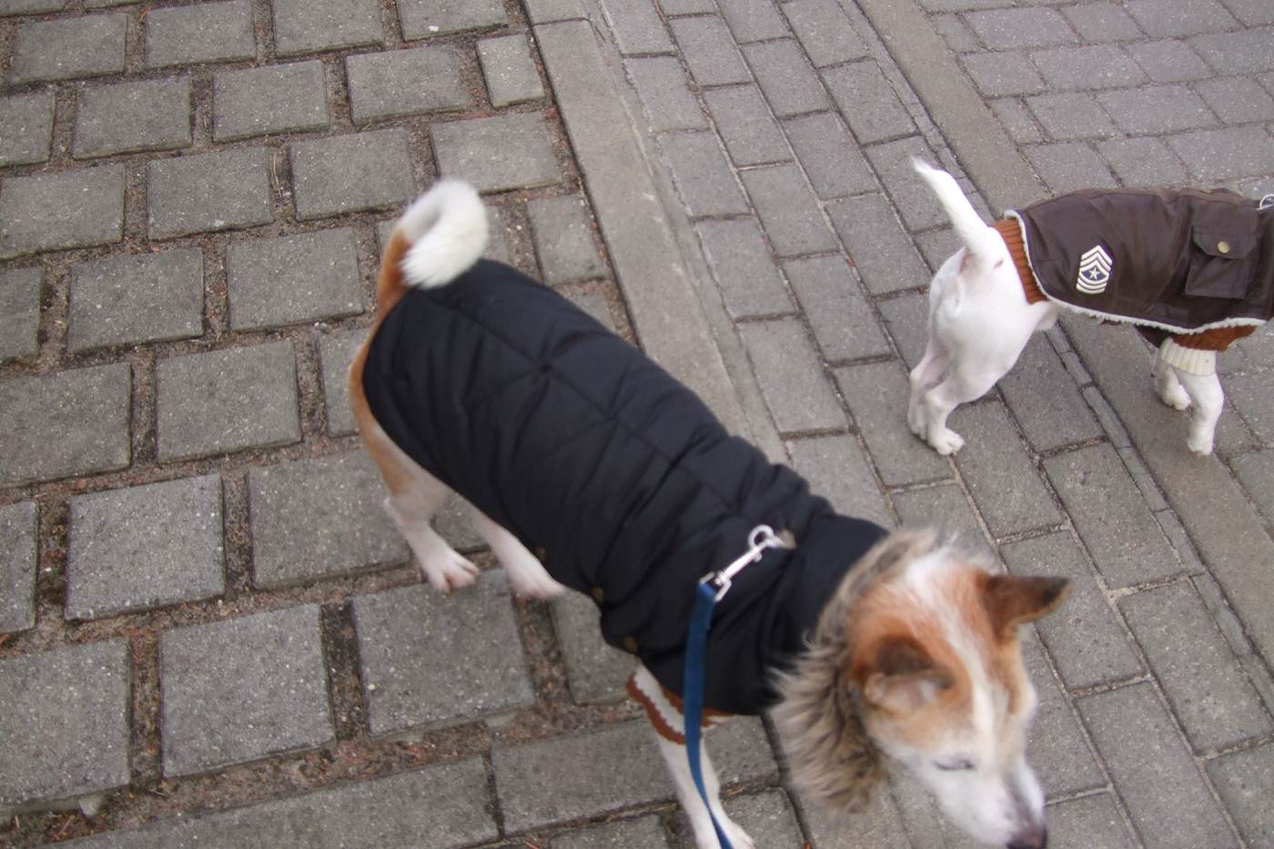 Ziehe beides aber auch nur an wenn ich vorhabe laenger als ne halbe Stunde mit ihnen zu gehen, wenn ich sie nur mal rauslasse bekommen sie nur die Maentel an Der Mantel fuer Toby ist allerdings ein bisserl kurz und zu klein, aber das war das groesste was wir fuer ihn bekommen haben, ausserdem war mein Freund so begeistert von dem Fliegerlook.... sieht auch klasse aus, fuer seine Groesse ist einfach alles schon vergriffen, bei Lissy hatten wir da ne groessere Auswahl, mir hat der dunkle blaue an ihr am besten gefallen und mit dem Fellkragen sieht sie so Ladylike aus *kicher* Wie wir sollen ruhig stehen? wir sind doch keine Models! Wir wollen laufen laufen laufen Toby sucht ne Maus....