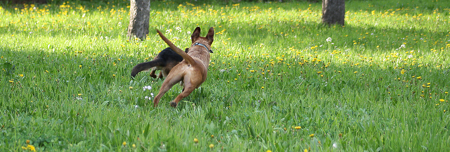 Bob und Mini haben sich auf Anhieb gut verstanden und so haben sie die volle Größe des Gartens (ca 6 potentiell bebaubare Grundstücke groß, mit alten Streuobstbäumen) ausgenutzt zum rennen, rennen, rennen, rennen...und spielen.