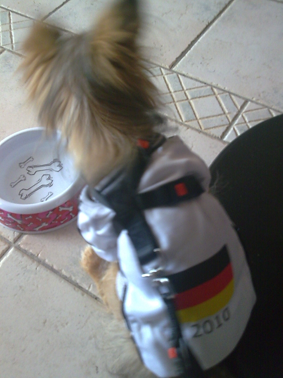 Und was mir mal wieder auffällt: Ich habe bisher nur kleine Hunde mit Deutschland-Trikot gesehen!!!