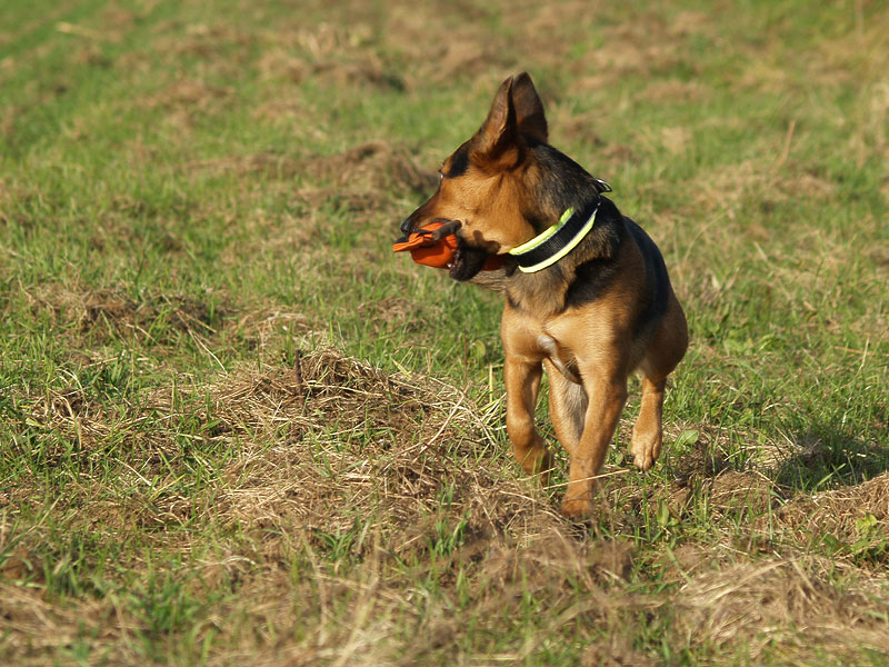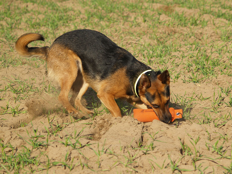 Minis Lieblingsstopp: Vorderbeine in den Boden, eine halbe Drehung mit dem Hinterteil, zeitgleich den Dummy packen und wieder zurück...