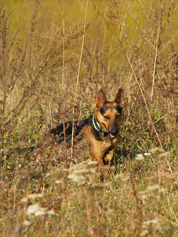 Ich hatte diesmal eine Werferin dabei um mal Abwechslung reinzubringen und damit ich in Ruhe knipsen kann. Sie wirft den Dummy von einem Feldrand aus, Mini darf los und als sie zu mir zurück kommt, ruft meine Freundin "oh, da läuft ein Hase".....