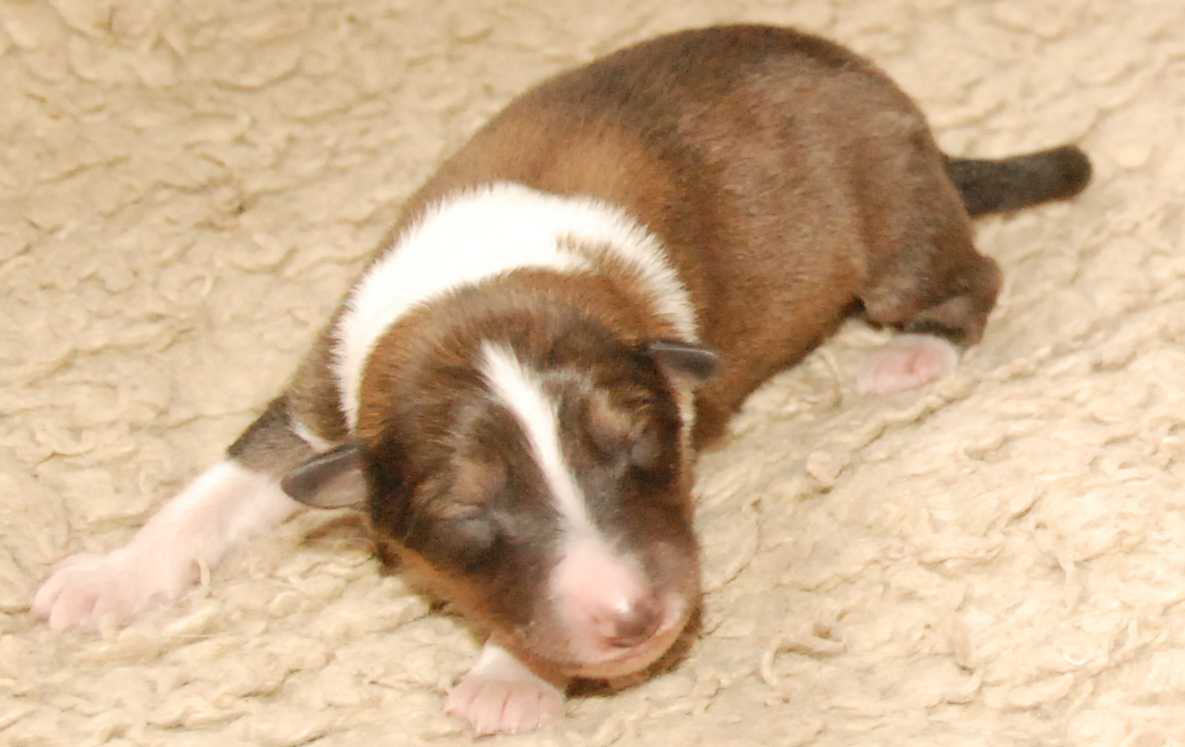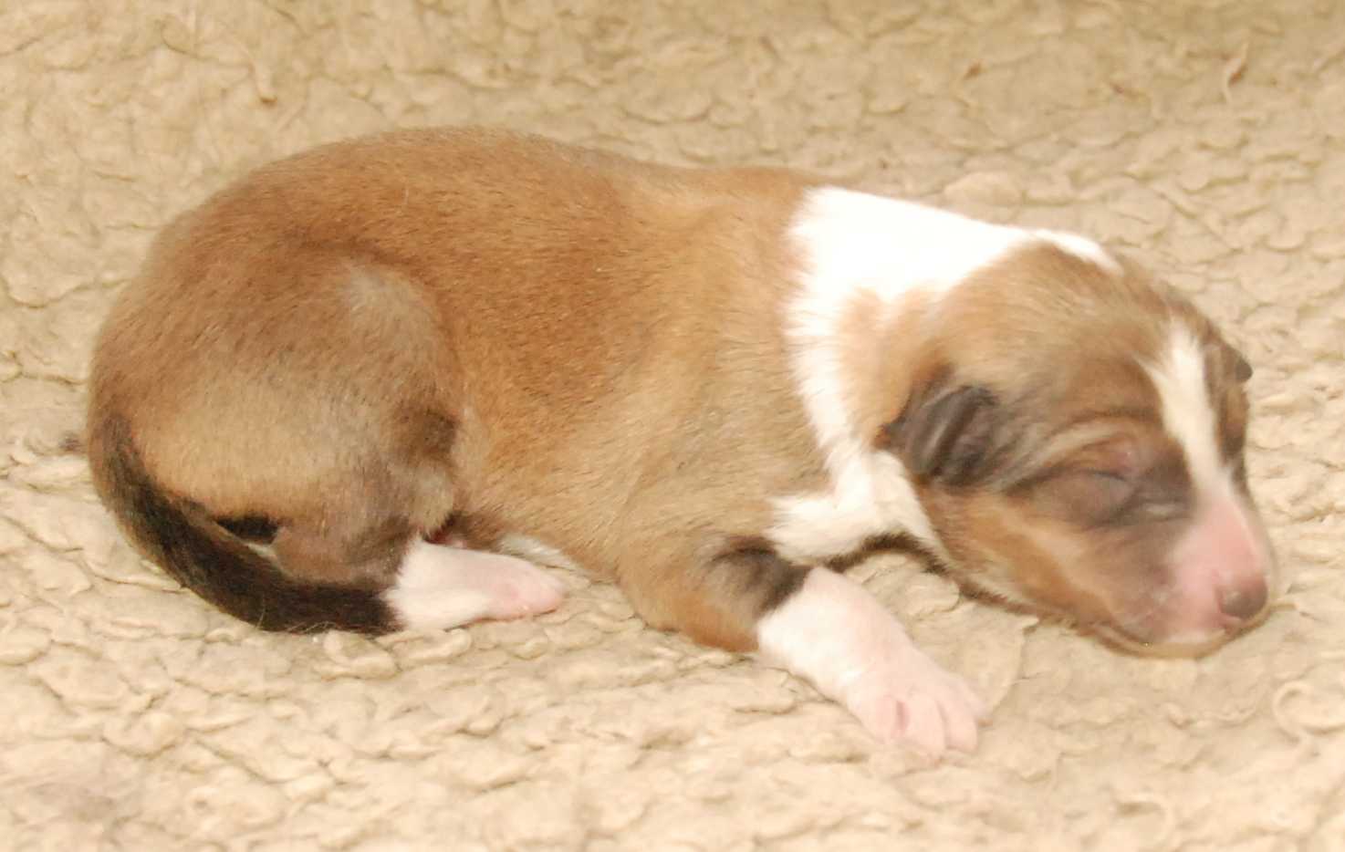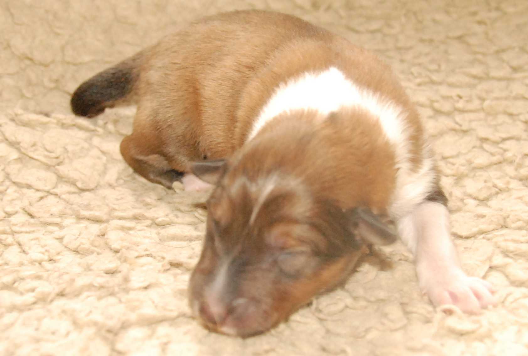 Ein neuer Wurf Amerikanischer Colliewelpen ist geboren. 3 Rüden und 2 Hündinnen, nicht viel, aber schon ganz schön groß mit Gesamtlängen von 27-30 cm (6-7 davon sind Rute) mit Geburtsgewichten zwischen 330-380 g.
