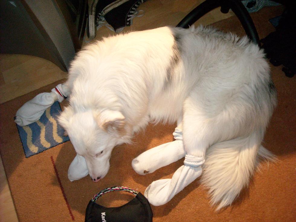 Achja, dazu muss er übrigens noch Socken anziehen. :D Damit er sich die Ballen nicht noch mehr abscheuert und sich die Salbe nicht ableckt. Er trägt weiße Tennissocken von dem Freund meiner Mutter. :D Das sieht vllt aus... *g*