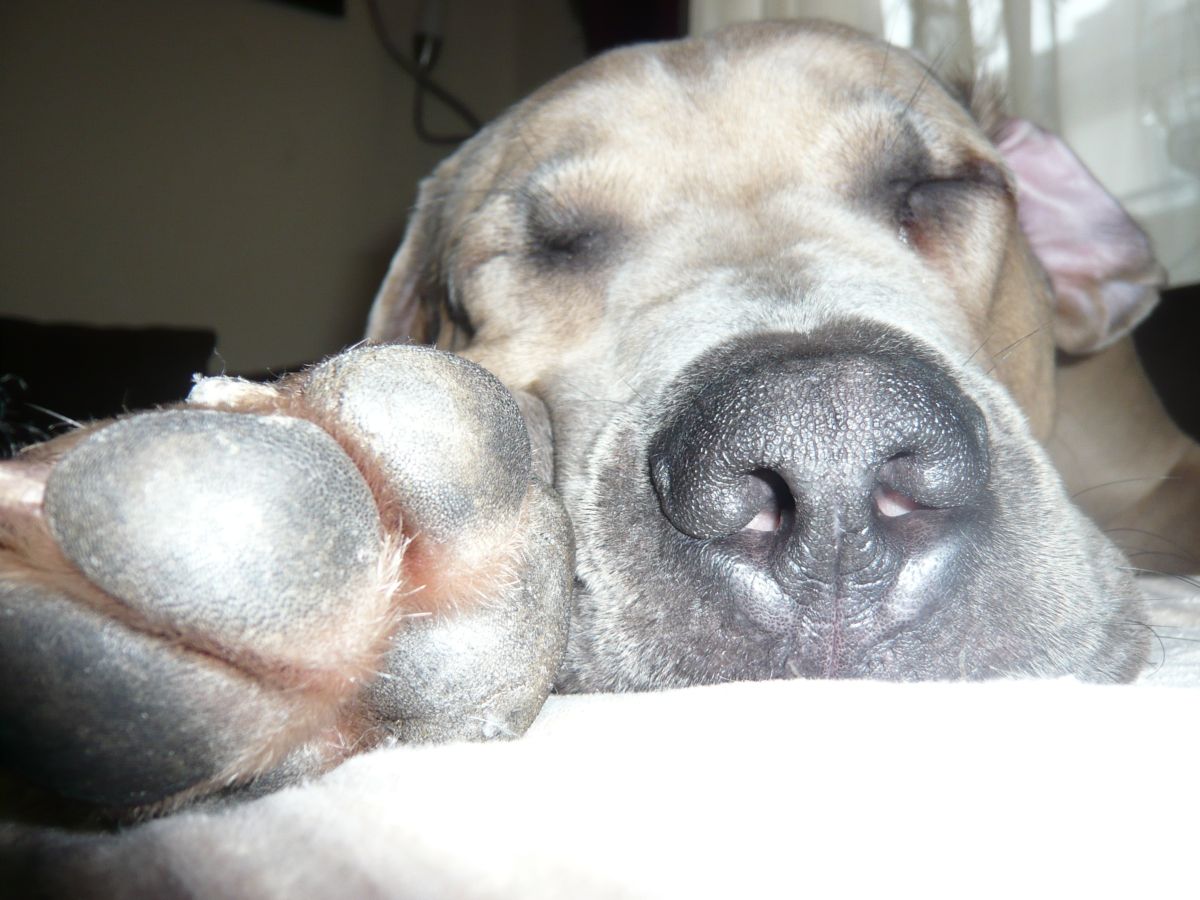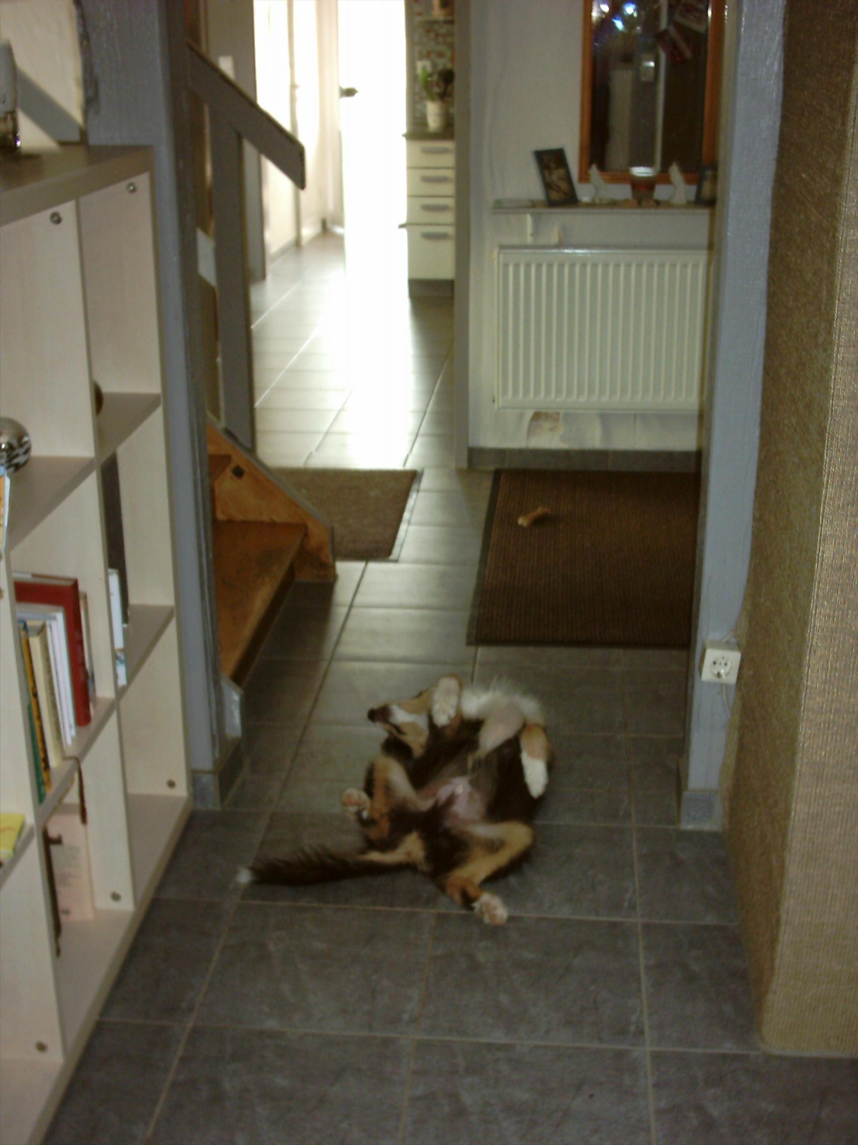 Oft legt sie sich auch ganz auf die Seite. Sie schnarcht nie und rollt sich auch nur ganz, ganz selten zusammen. Wenn sie träumt, dann zucken erst die Pfoten, irgendwann läuft sie zaghaft und dann kommt schließlich ein unheimlich süßes Wuffen dazu, von dem sie dann allerdings meist wach wird.