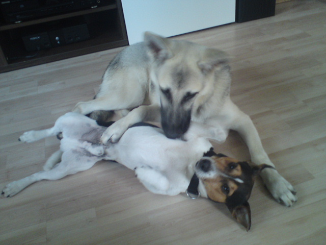 Die beiden verstehen sich sehr gut und spielen nonstop. Wenn wir mit beiden gehen, habe ich keine Möglichkeit Tala auszubilden, weil nur gespielt wird. Gehe ich alleine mit Tala, ist schon immer etwas Ausbildung mit dabei.