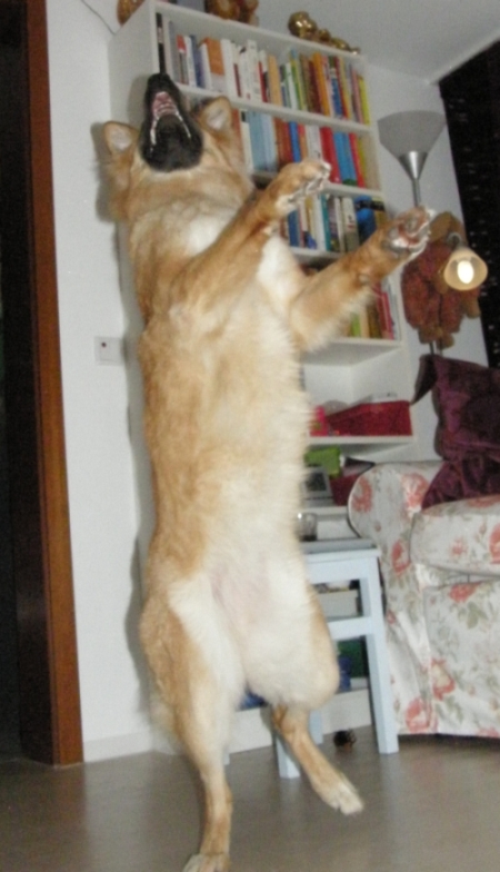 Am Freitag und gestern hatte Kiara ganz schlimm Durchfall. Man, war das eine Sauerei... Zum Glück gibt es Küchenpapier. Mit Kohletabletten, Nulldiät und heute Reis mit Hühnchen scheint ihr Magen nun aber wie ins Lot zu kommen. Trotzdem ist sie quietschfidel und scheint es mir nicht übel zu nehmen, dass die Spaziergänge jetzt während der Standhitze kürzer ausfallen. Leider komme ich hier nicht umhin, Rüden zu treffen. So übe ich mich also im Moment im Rüden abwehren und anknurren, was bei den meisten auch wirkt. Und eben hatten wir einen tollen Fortschritt: Kiara blafft bei Geräuschen im Hausflur ab und zu rum, wenn es direkt auf unserer Etage ist. Manchmal bellt sie dann auch, wenn es ihr zu unheimlich wird. Eben hat es also mal wieder gescheppert draußen, sie hat einmal kurz gegrummelt, kam dann zu mir gerannt und legt sich unter meine Beine nach dem Motto: Pass du mal auf, das macht mir Angst. Knuffig =)