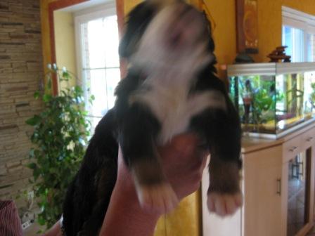 Sie will ja auch ein großer Berner-Bär werden, also muß man früh anfangen mit futtern. Sie ist aber nicht die schwerste, der dickste ist der Ben. und das Aussuchen ging so: Die Züchterin hat uns alle Mädels aus dem Wurfzimmer ins Wohnzimmer geholt, weil Mama noch sehr eigen mit ihren Babys ist, es darf noch kein Fremder so richtig dran. Also hat sie alle 8 ins Wohnzimmer auf die Decke geholt. Dann haben wir mal langsam angefangen, auszusortieren. Die Belisha hat eine gezackte Blesse gehabt (nicht so schön), Bea hat extrem viel weiss (auch nicht so schön) und zusätzlich einen weissen Nackenfleck. Und so haben wir uns runtergearbeitet auf Baghira, Basha und Buffy, die wir von den Fotos schon in der Auswahl hatten. Baghira haben wir dann auf den Arm genommen zum näher betrachten und dann geschah es, Madam hat Herrchen auf die Hand gepieselt Tja, und da war es geschehen. Die Maus mußte es sein. Bilder kommen auch noch welche, ein paar muß ich noch klein machen