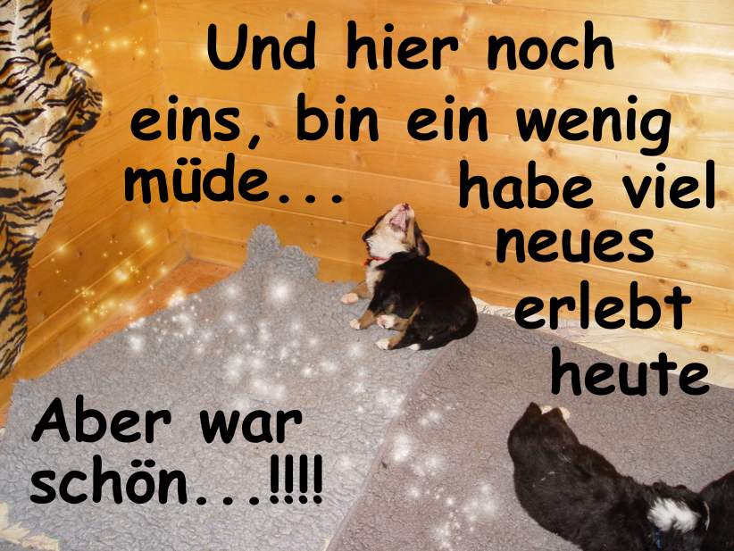 Re: Berner-Baby-AlarmOh nein, bekomme grad Nachricht von der Züchterin, ob wir nicht bitte erst übernächsten Samstag kommen können, weil jetzt natürlich soviele kommen wollen (bei 15 Welpen kein Wunder) und der ganze Besuch die Mama (Kaiserschnitt) und Babies (noch so klein) doch sehr anstrengt.