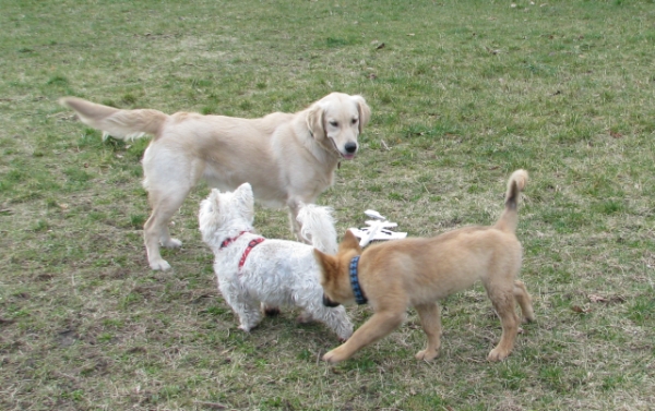 wir erleben so viel zur Zeit, dass ich gar nicht mehr zum Schreiben komme. In den ersten Tagen war mir alles ein bisschen viel: Fernweh, Jetlag und dann noch ein Baby. Doch nun hat sich mit der lieben Unterstützung meiner Mutter alles entspannt und uns beiden geht es gut. Seit Samstag gehen wir zu einer tollen Hundeschule in die Welpenspielgruppe. Am Montag waren wir zum ersten Mal bei der Tierärztin, die sie auf unter 4 Monate geschätzt hat, ansonsten ist sie topfit und muss erst wieder in einem Jahr hin. Ich warte nun also gespannt auf den Zahnwechsel, um zu wissen, wie alt sie denn nun ist. Inzwischen sieht sie aus wie ein kleiner Fuchs. Ihr Aalstrich ist dunkler geworden, nur viel wachsen tut sie zur Zeit nicht, auch wenn sie inzwischen 9,2 kg wiegt. Längst hat sie ihre Lieblingsspielkameraden gefunden und da "Komm" draußen schon richtig gut klappt (wie auch nicht, schließlich bin ich die "Würstchenkönigin" Neue Fotos mache ich morgen im "Kindergarten."