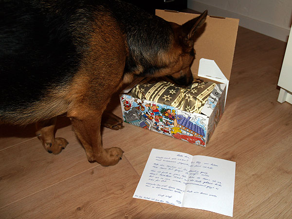 Re: Wichtelpakete auspacken ...So, jetzt endlich will ich mal ein Bildchen posten....leider hat mein altes Handy inzwischen den Geist aufgegeben, sodass die Bilder vom Auspacken nicht mehr abrufbar waren. Deshalb habe ich nur ein Foto auf dem Günni bereits mit seinem Wichtelgeschenk schmust.
