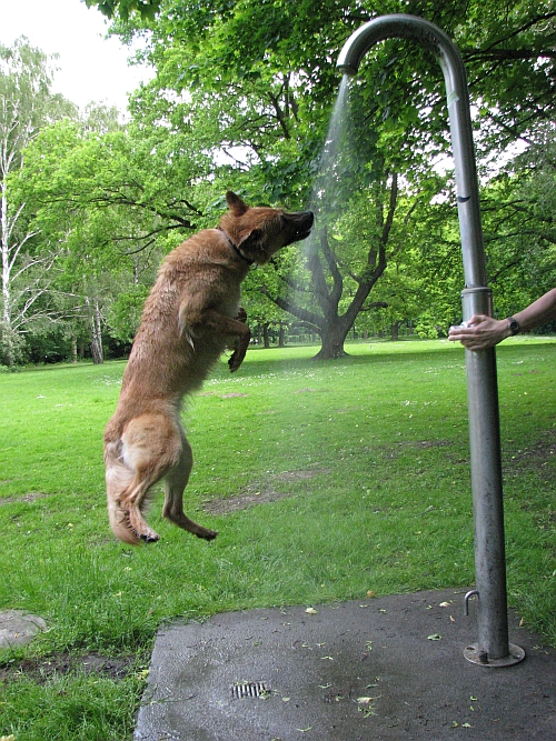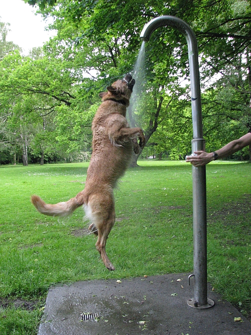 Neulich waren mein GF (Götterfreund) und ich in Berlin wandern. Die Dusche im Tiergarten hatte Kiara zum Fressen gern: