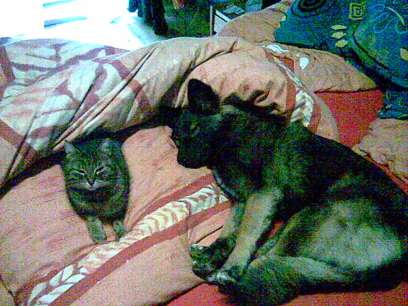 - Leah und Molly, friedlich vereint. Und wer jetzt wissen möchte, wo ich meinen Platz habe: zusammengerollt auf dem Kopfkissen. :o))))
