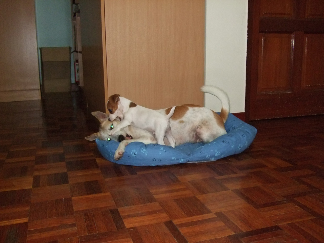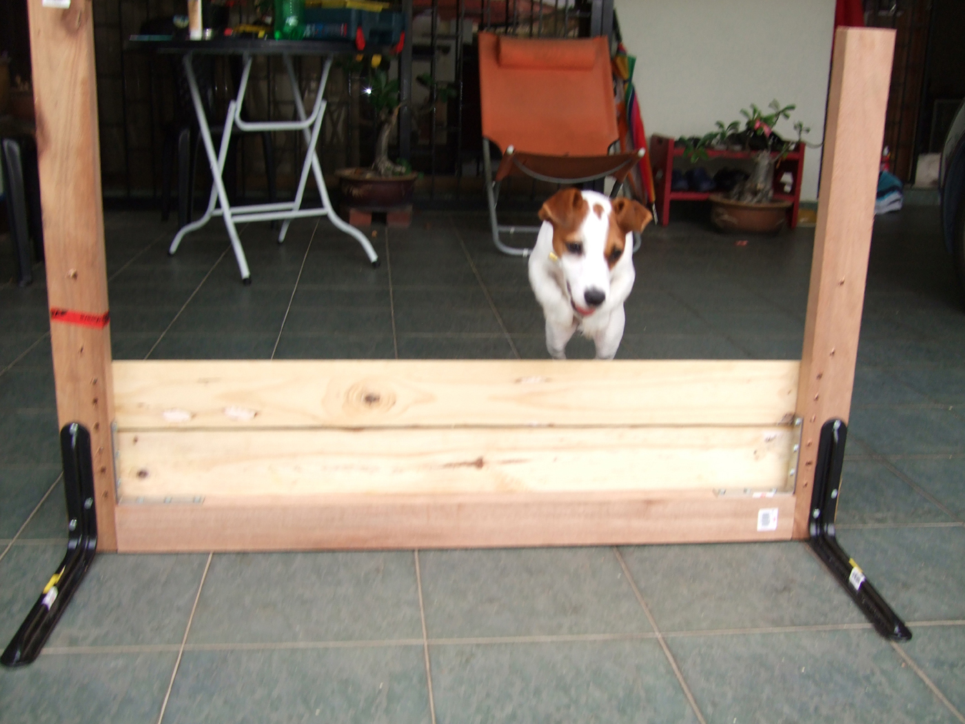 muss allerdings zugeben, das Lissy hoeher springen kann, aber deswegen hab ich nu auch angefangen mein Futter wieder richtig aufzuessen damit ich groesser und staerker werde, eines Tages werd ich der Angeberin schon zeigen, das ich das auch schaffe Das hat uns Herrchen gebaut, kann man in der hoehe verstellen, spring da auch so drueber ohne das Frauchen Hopp sagt... aber wenn sie es sagt macht es noch mehr Spass, denn dann gibts immer Leckerli!! Achja wollt mich mal bei euch bedanken fuer die vielen Tipps und Ratschlaege die Frauchen hier so gelesen hat. Wisst ihr am Anfang hat mich Frauchen immer hinterhergeschleift (nicht das ihr mit ihr schimpft, mit geschleift meine ich nur das ich bockig war und mich gegen die Leine versucht hab zu stemmen so fuer 2 Schritte, dann bin ich ja immer hinterhergetrottet) wenn ich nicht nach Hause wollte, dann hat sie hier gelesen das man das nicht machen sollte sondern mit Leckerli locken.... hat sie auch gemacht... naja ich habe dann gelernt... ich bleib stehen, muss noch ein paar Schritte laufen und ich bekomm Leckerli.... allerdings hab ich das dann wohl ein wenig uebertrieben... Frauchen hat dann keine Leckerlis mehr mitgenommen... Nu hat sie immer nen Ball dabei an dem ne Schnur dran ist... sie kennt mich halt ganz schoen gut und weiss genau, das ich da nicht wiederstehen kann, dem muss ich einfach hinterher jagen wenn sie ihn wirft.... und eh ich mich versehe sind wir lange unterwegs gewesen ohne das ich rumgezickt haette ausser die Strassen sind mal wieder sooo heiss da mag ich dann halt gar nicht drauf laufen... und bleib dann halt lieber liegen So nu geh ich wieder Heia machen.... bis die Tage