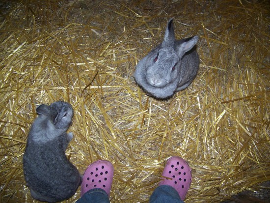 2 unserer 3 Kaninchen...Laya ist die Mama von Klopfer. Ein Bekannter hatte sie uns geschenkt, wo ich wirklich schockiert über die Haltung war!!! Sie leben in Außenhaltung, das Gehege ist ca. 10 qm groß...Wie sie möchten können sie entweder nach draußen oder in den Innenteil, der sich in unserer Scheune befindet...