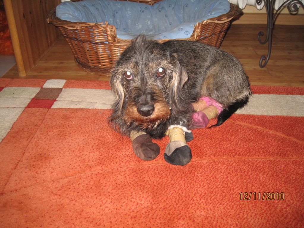 Meine Dackeldame Anni kaut sich seit ein paar Tagen ständig an den Ballen rum. Wir waren beim Tierarzt und der hat erst Gelenkprobleme diagnositiziert. Sie kaut an den Ballen rum, weil sie die Akupunkturpunkte stimuliert. Die Tierärztin hat dann Akupunktur gemacht und wir sind nach Hause und Anni hat noch mehr gekaut. Die Ballen waren schon richtig offen.