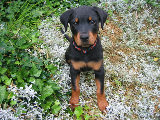Hallöchen, Danke für das Kompliment - sie hat wirklich einen schönen Brand (richtig  Ich habe sie mir schon am 8. Tag ausgesucht, da es mir schien, dass ich diesen Brand immer wieder erkennen werde (die 11 Geschwister waren alle wesentlich dunkler - nicht, dass mir noch einer meine Kleine vertauscht  ) - damals war sie die ruhigste, aber irgendwann zwischen KW 4 und 6 muss bei diesem Krawall-Mädel irgendwas schief gelaufen sein  Sie hat sich zu einem Temperamentbündel hoch 10 entwickelt - anstrengend, aber liebenswert Morgen geht es dann zum Doc und ich hoffe, dass alles gut geht - werde Euch auf jeden Fall auf dem Laufenden halten. Drückt uns die Daumen, damit ich weiterhin ein glückliches Rotti-Mädchen fotografieren kann und kein krankes.... Bye