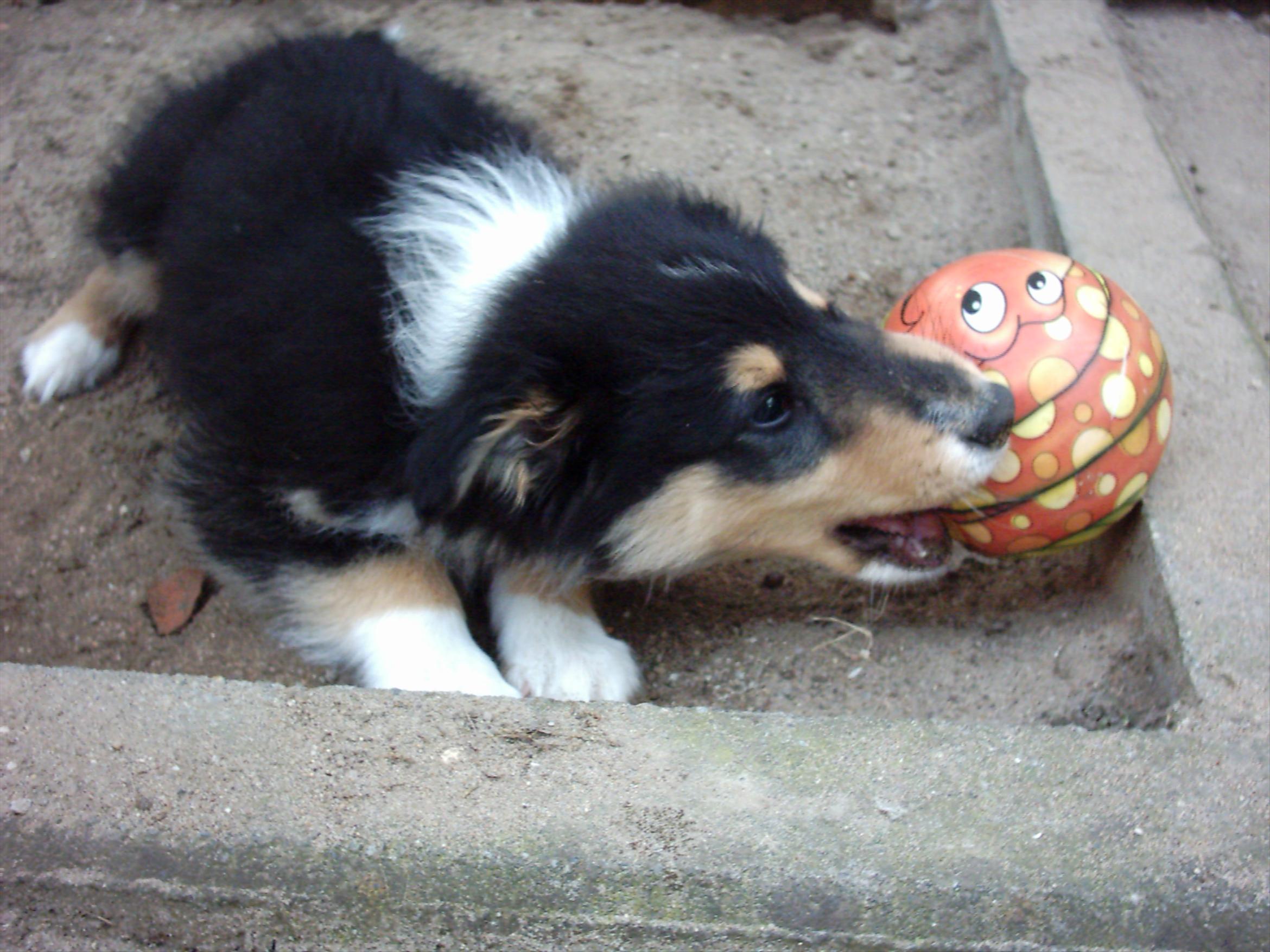 In der Hundeschule hat er letzt mit einem "Ferkelball" gespielt, der ist aus Hartplastik und unzerstörbar.