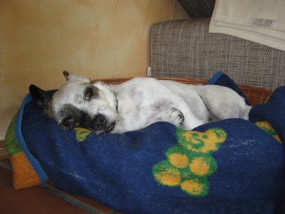 Meine arme kleine Peggymaus liegt in ihrem Körbchen und zittert wie verrückt weil sie grad im Garten in eine Biene getreten ist. Hab den Stachel sofort gesehen und rausgezogen, danach die Pfote unter kaltem Wasser gekühlt.