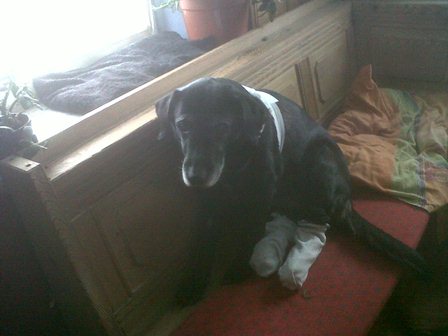 also, töll hat ja jetzt so eine 15 cm genähte wunde, die der arzt gestern erstmal mit binden zugemacht hat, damit er nicht kratzt, naja dann habe ich gleich noch schuhe bei fressnapf gekauft,