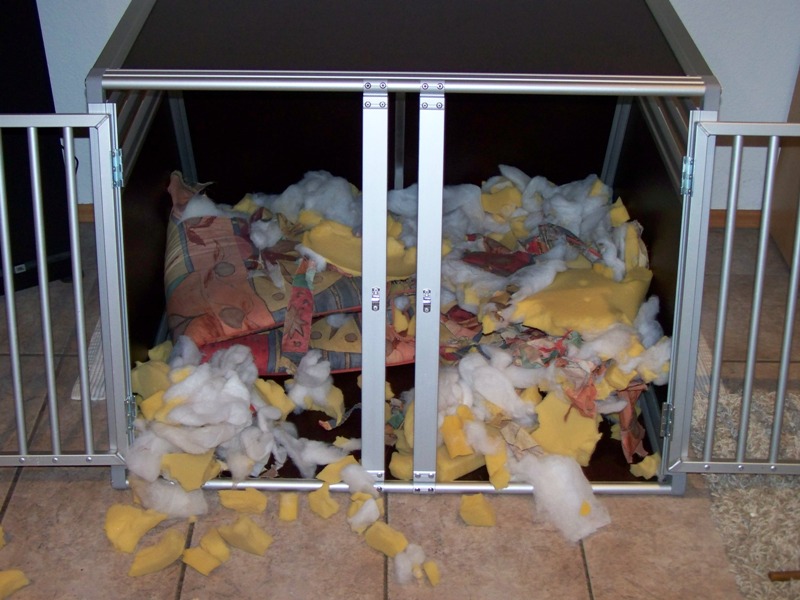 Hallo! Wir haben zwei Galgos, die Hündin "Scully" (im Juni 2,5 Jahre geworden) und den Rüden "Pepper" (ist jetzt 9 Monate alt). Pepper haben wir Ende Mai bekommen, er ist seinem Alter entsprechend noch sehr sehr verspielt. Das Problem dass wir mit ihm haben ist, dass er anfängt Gegenstände aus der Wohnung kaputt zu machen, sobald er länger als ca. 30 - 45 Minuten allein ist (das heißt, ganz allein ist er ja nicht, denn Scully ist ja dann auch noch da). Er klaut dann z.B. Dinge von der Arbeitsplatte in der Küche, der Theke zwischen Küche und Wohnzimmer (1,15m hoch) oder von der Truhe in der Diehle. Da waren schon ein Navi und eine 100,00 EUR teure Sonnenbrille bei (das tut weh...)!  Wir haben uns auch schon eine große Alubox für das Auto gekauft und haben die beiden Hunde an diese Box gewöhnt. Die steht mit im Wohnzimmer und Pepper geht da sogar freiwillig rein, legt sich hin und pennt dort drin. Wenn er aber in der Box ist und wir länger als 45 Minuten weg sind fängt er an in der Box zu kratzen und wenn noch etwas mit in der Box ist wie z.B. eine Decke, wird das komplett zerfetzt! Er steht dann auch völlig unter Stress wenn man zurück kommt und ihn wieder raus lässt. Einen änlichen Stress hat er auch wenn er nich in der Box ist und man nach 45 Minuten oder länger zurück kommt und er wieder etwas zerstört hat! Sobald jemand zuhause ist (da reicht auch unser 13 jähriger Sohn), ist alles super und Pepper ist total lieb! Wir haben schon so eine Art Mausefallen aus Plastik überall aufgestellt, wo er nicht dran soll oder eine Pyramide aus leeren Getränkedosen, die zusammenbricht wenn er dort dran kommt. Er erschreckt sich dann auch aber es hält ihn nicht davon ab es beim nächsten Mal noch einmal zu versuchen. Sicher spielt sein aktuelles Alter von 9 Monaten eine Rolle bei seinem Verhalten und ich hoffe, dass sich das legt in nächster Zeit. Trotzdem wäre ich für ein paar Tips sehr dankbar....!  Das Bild zeigt die Alubox in der Pepper 60 Minuten war (wir waren in der Zeit bei Nachbarn). Die Stücke waren mal zwei alte Gartenstuhlauflagen.