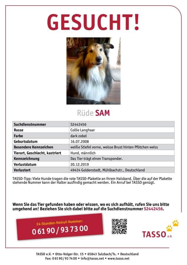 Bitte haltet Augen und Ohren offen !!! Vielleicht ist in den letzten Tagen ein neuer Collie in eurer Nachbarschaft eingezogen der da nicht hingehört oder es kommt euch irgendwie komisch vor. Sam ist 11,5 Jahre alt und humpelt vorne rechts mal mehr mal weniger. Wir müssen leider davon ausgehen das irgendwer meinen Hund einfach in ein Auto eingeladen hat und ihn gestohlen hat, seit Freitag den 20.12.2019 spurlos in 49424 Lutten verschwunden. Ganz wichtg ist keine Einfangversuche zu starten, sagt uns nur beischeid wo er sich aufhält.