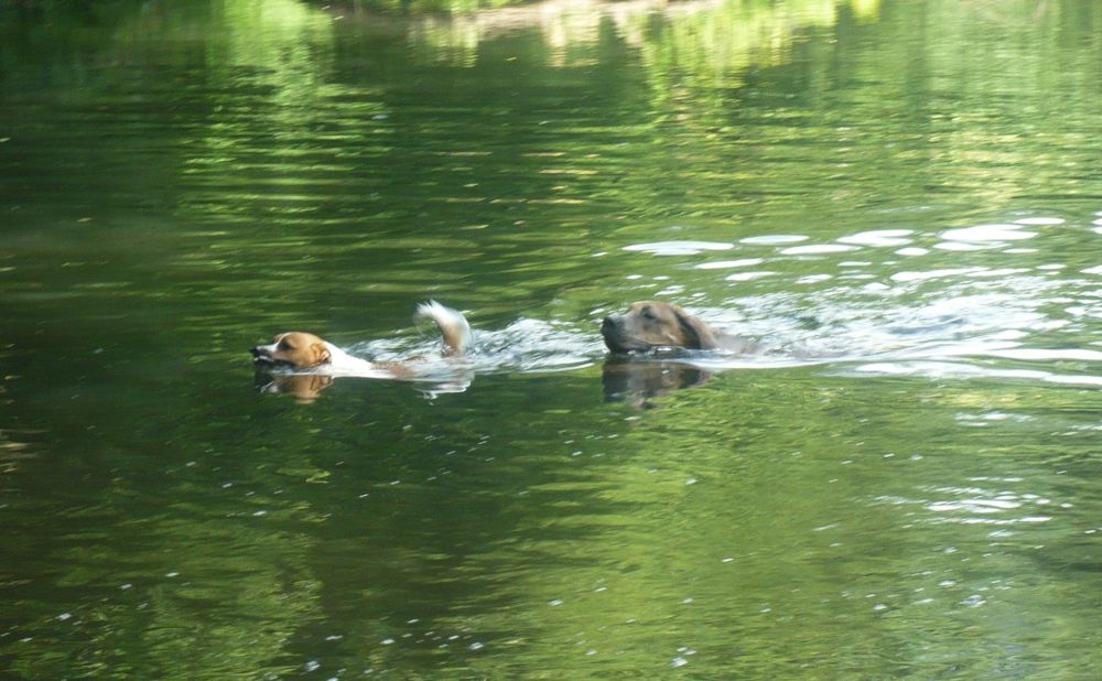 Wenn wir rumräubern auf unserer Hundewiese, rennen und in den Bach hüpfen hält Jacko bereits genauso mit wie Leah.