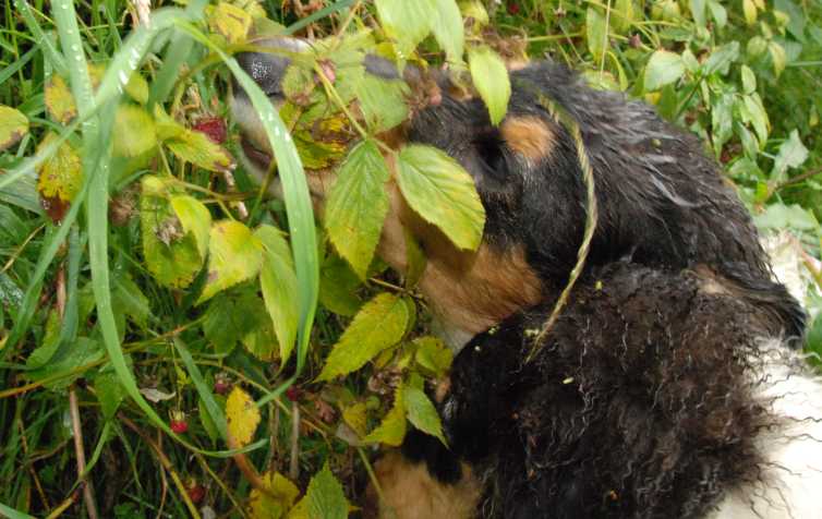 anbei ein Foto, was beweist, dass die Pincettenschnauzen der Collies durchaus einen Sinn haben, nämlich bei der Beerenjagd. Da sind meine Spitzmaulteddys allen Breitmaulhunden haushoch überlegen. Wie zuvor Belana ihren Kindern aus A-, B- und C-Wurf zeigte, wie man erfolgreich erlaubte Süßigkeiten findet und nascht, so hat auch Ballota ihre Söhne Kevin und Kolja in die Wald-Erdbeer-Gefilde, auf die Himbeerweiden und in die Blaubeerjagdgründe mitgenommen. Jetzt erbeuten sie schon ganz selbständig und überaus erfolgreich die leckersten Früchtchen.